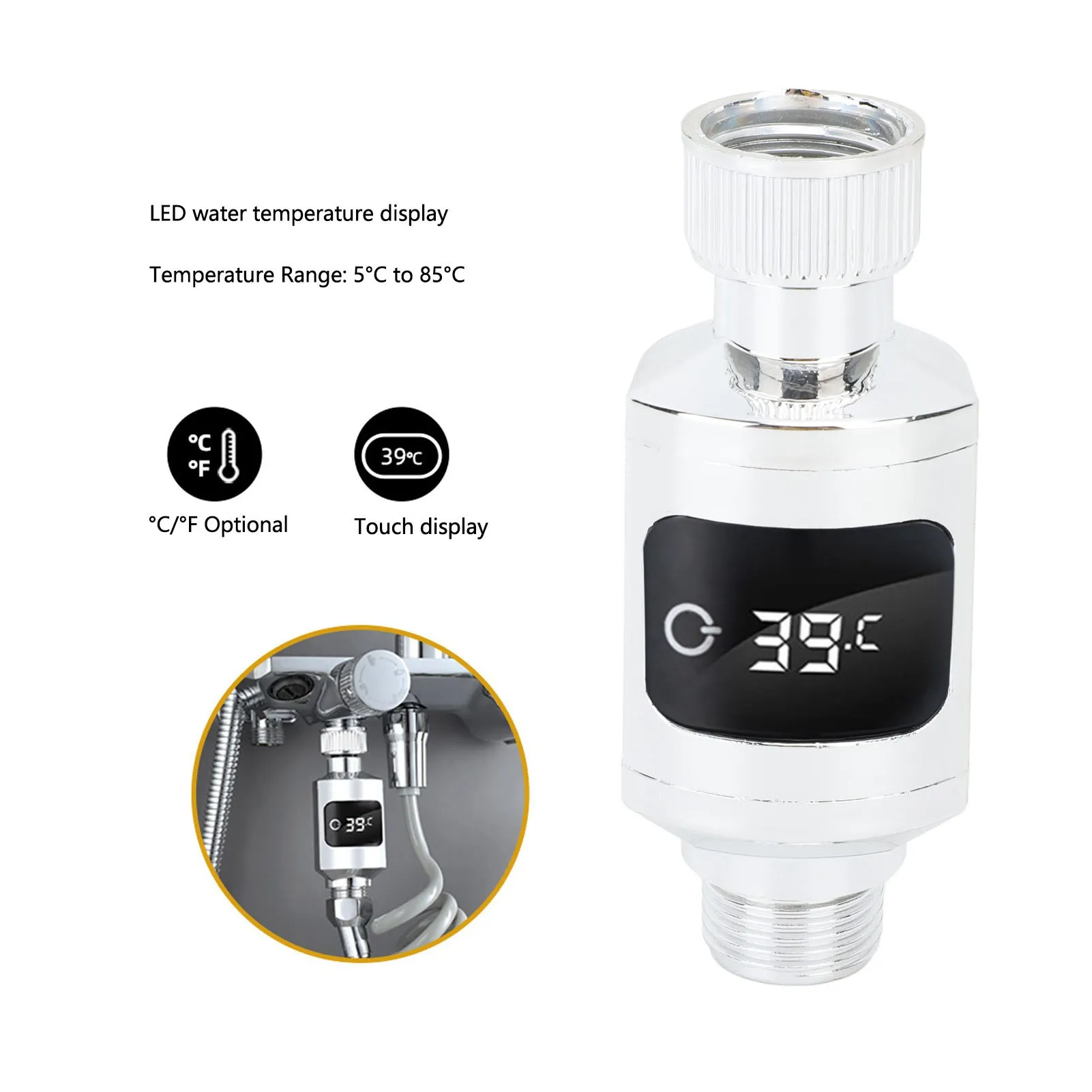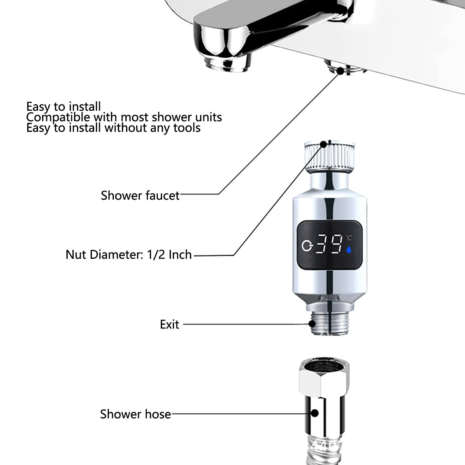 4.Installation et fonctionnement faciles : doté d’un diamètre d’écrou de 1/2 pouce, ce thermomètre de douche peut être directement connecté au robinet, ce qui le rend simple et convivial à installer.