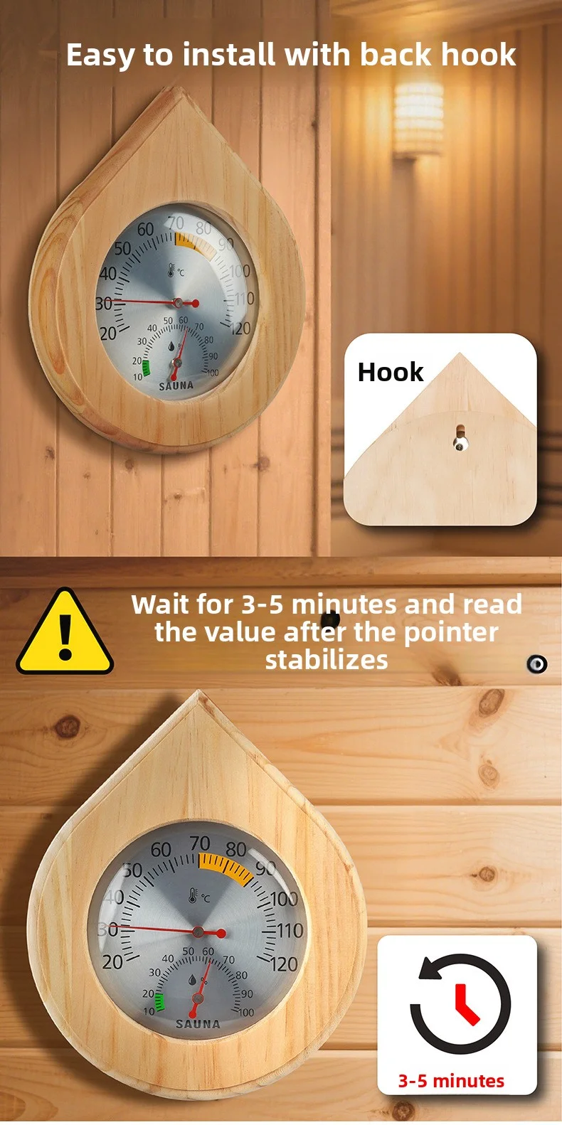 Doté d’un crochet arrière intégré, cet hygromètre thermomètre de sauna mural s’installe facilement sans aucun outil.Idéal pour les saunas à domicile, les spas publics et les centres de bien-être hôteliers, vous garantissant de toujours rester dans la plage de température idéale.