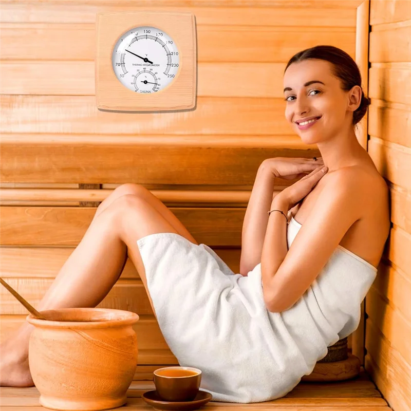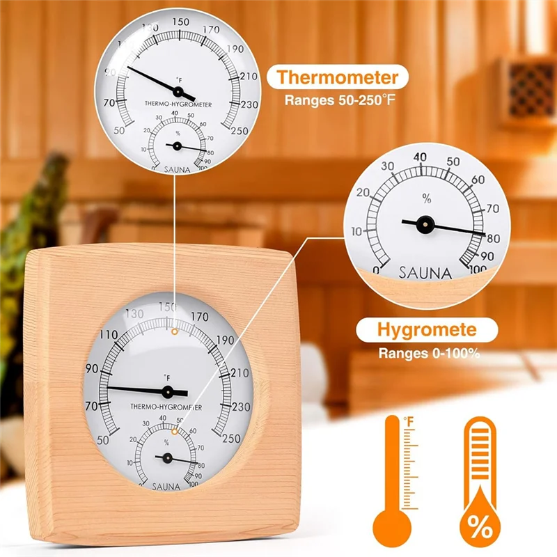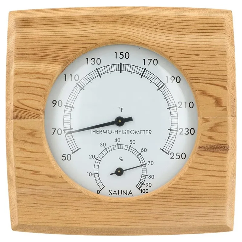 Accessoires de sauna largement utilisés : ce thermomètre et hygromètre de sauna en bois, convient aux salles de sauna d’hôtel, familiale et autres avec mesure de la température et de l’humidité intérieures.