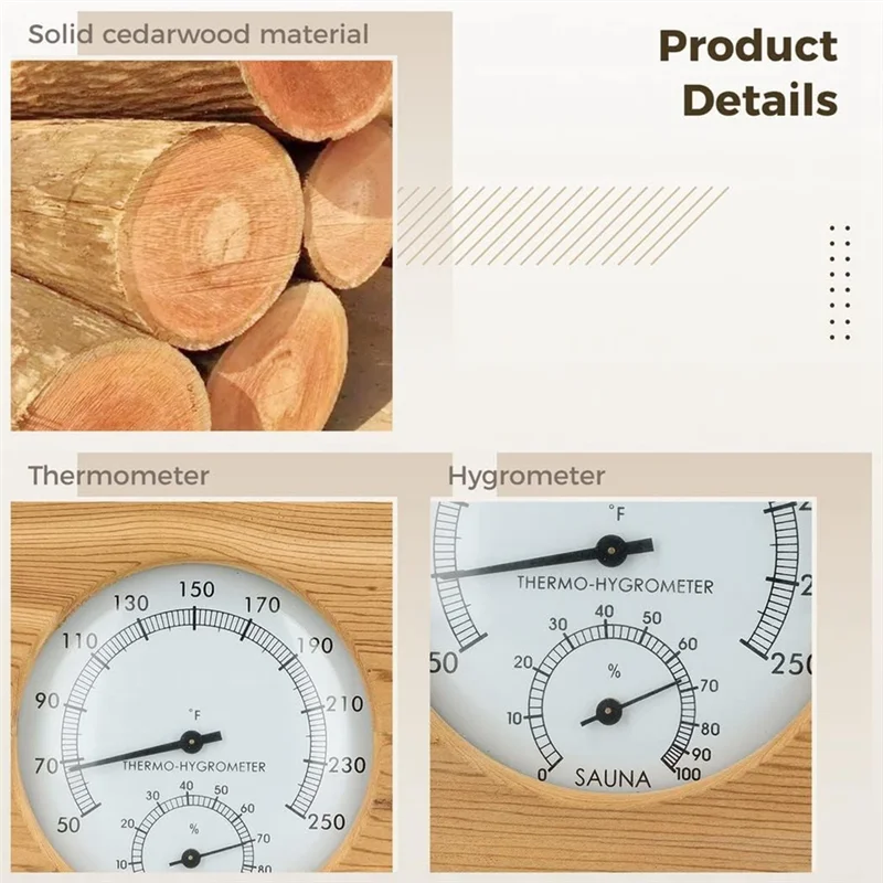 Haute visibilité et double température : le thermohygromètre de sauna est fabriqué en bois de cèdre naturel, avec une lentille en verre robuste, l’échelle est clairement visible et facile à lire simultanément les températures Celsius et Fahrenheit.