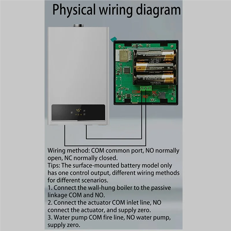 Utilisation du produit : contrôlez le démarrage et l’arrêt de la chaudière murale, ou contrôlez l’actionneur électrique (NO normalement ouvert, NC normalement fermé) ou moins de 600 W d’eau.