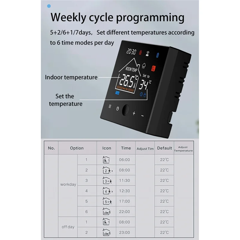 4.Contrôle de l’heure programmable, affichage de l’humidité, affichage météo, sécurité enfant, mode manuel/automatique/thermostat