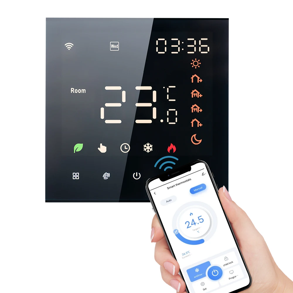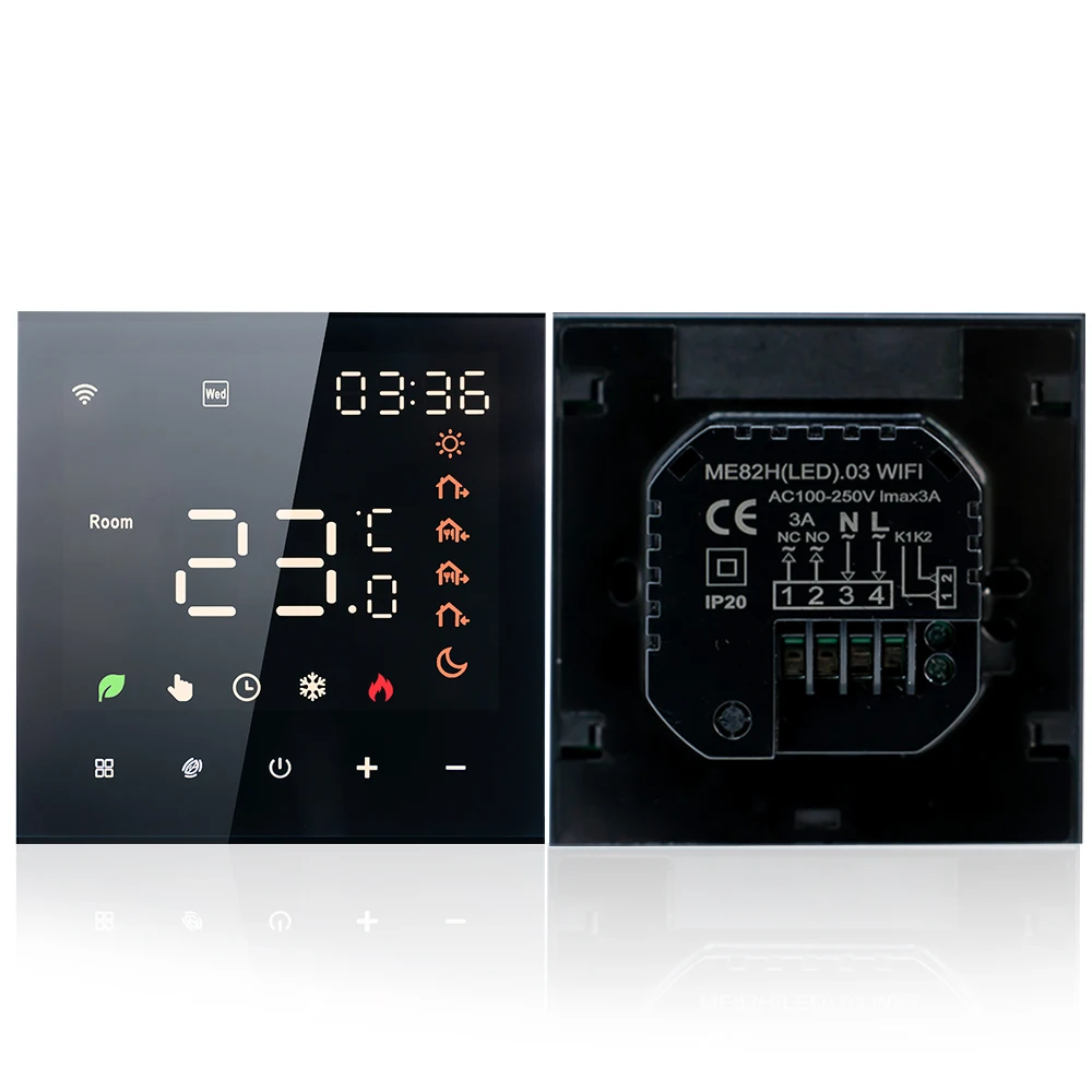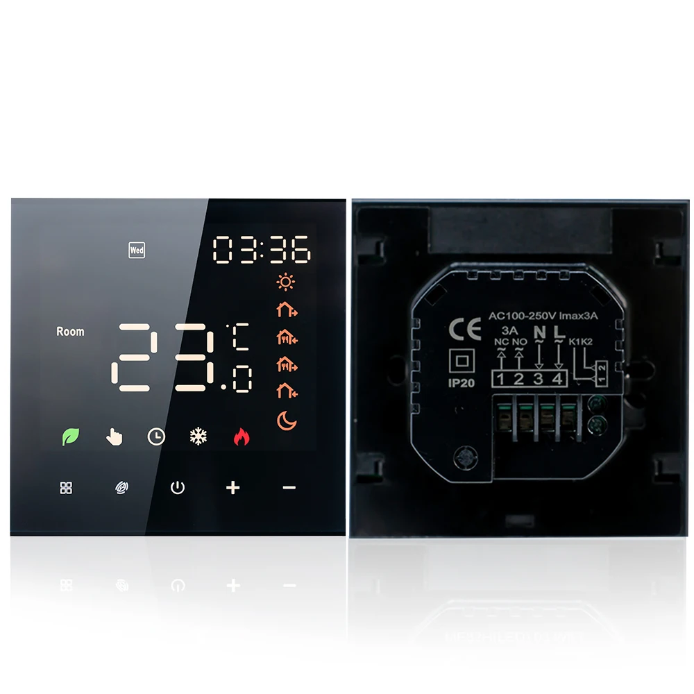 Capteur de température NTC : AC 100-250 V et 5-70°La plage de réglage C rend le thermostat intelligent adapté à un large éventail de maisons et équipé d’un capteur de température NTC, fournira des lectures précises de température et garantira un contrôle précis de la température.