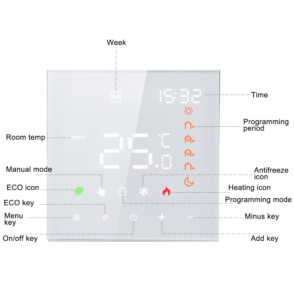 Mode manuel et automatique : les modes manuels et automatiques, vous permettant de définir la température du thermostat mural au niveau souhaité et économisez sur les coûts énergétiques.La commande vocale intelligente peut compatible avec Amazon et Google Home.