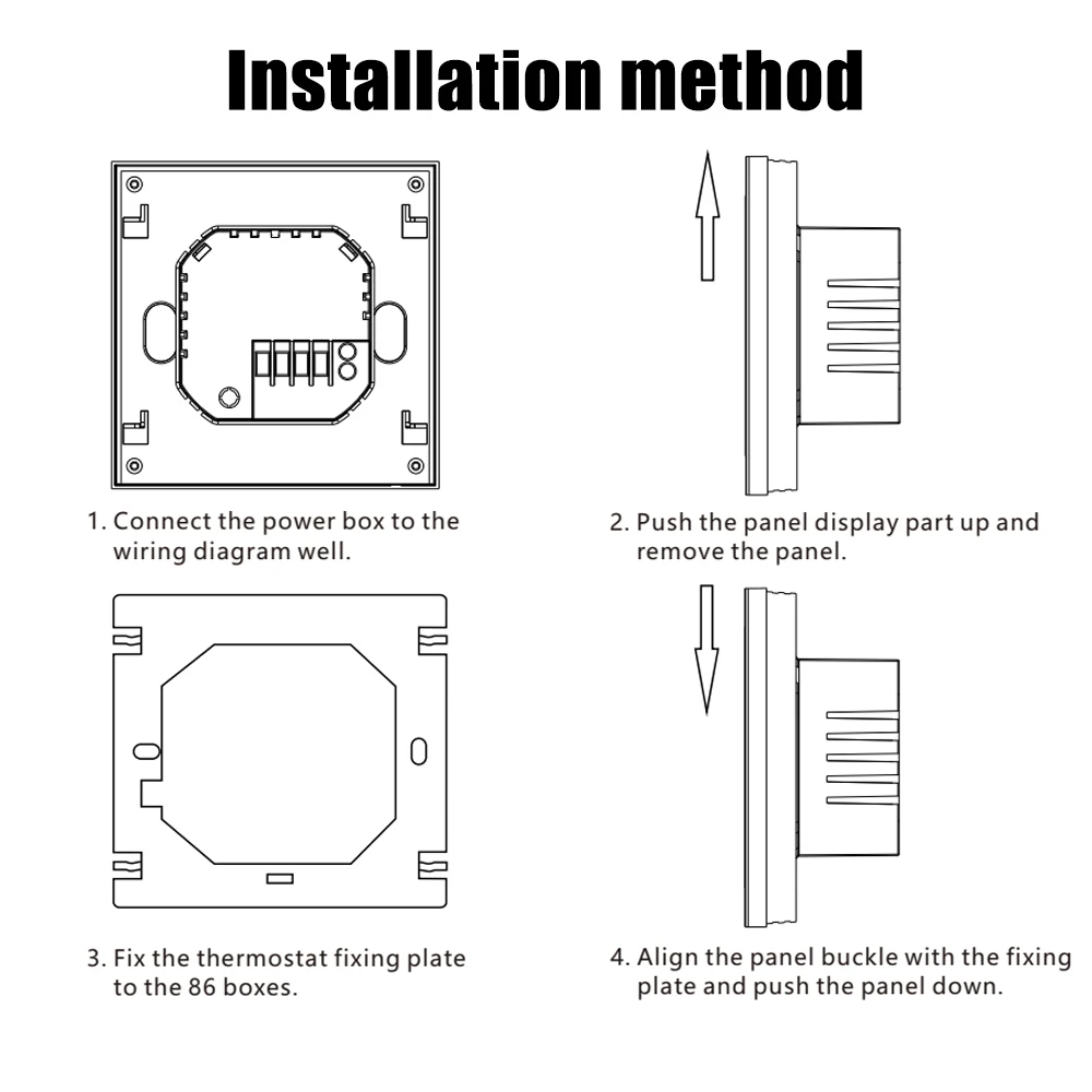 Installation intégrée : ce thermostat numérique télécommandé Tuya est conçu pour une installation intégrée, et la méthode d’installation est la suivante : connectez bien le boîtier d’alimentation au schéma de câblage ;Poussez la partie d’affichage du panneau vers le haut et retirez le panneau ;Fixez la plaque de fixation du thermostat aux 86 boîtiers ;Alignez la boucle du panneau avec la plaque de fixation et poussez le panneau vers le bas.Sa taille compacte et son processus d’installation simple en font un excellent choix pour le chauffage électrique par le sol ou le chauffage par le sol à eau.
