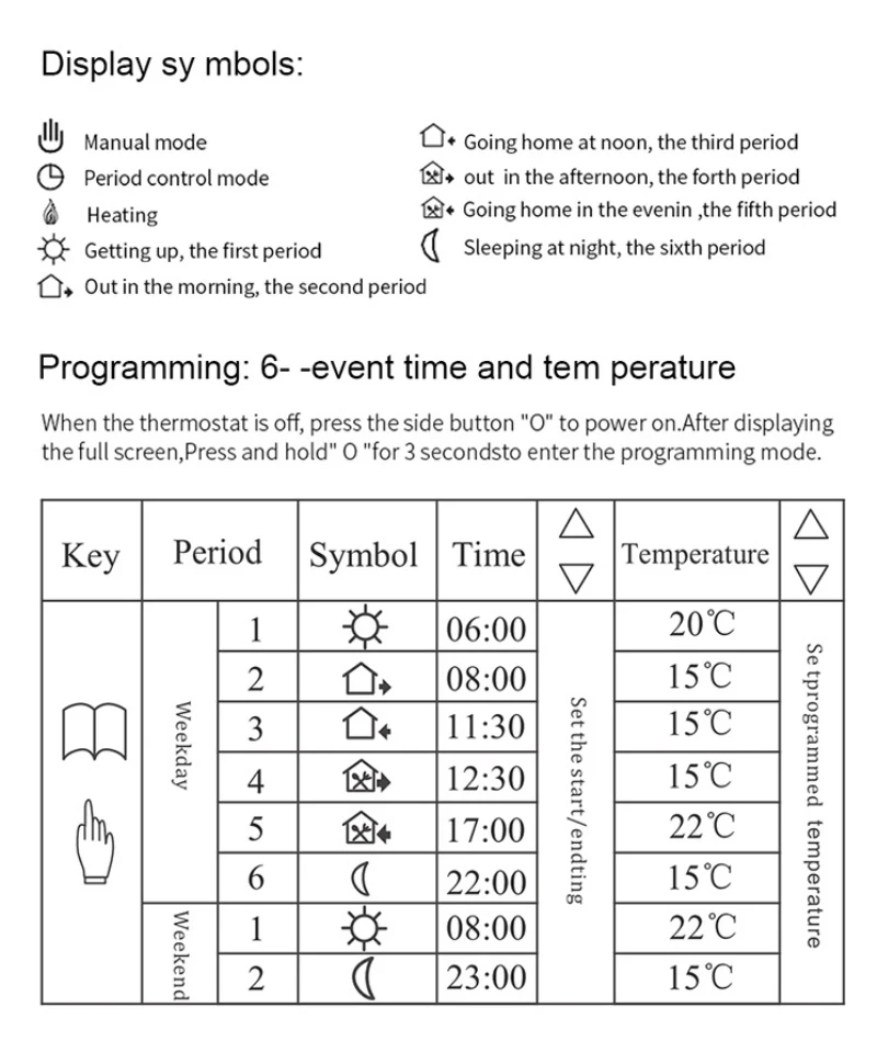 [Programmable hebdomadaire]-Le thermostat prend en charge différents réglage de température en conséquence avec 6 modes de temps quotidiens.