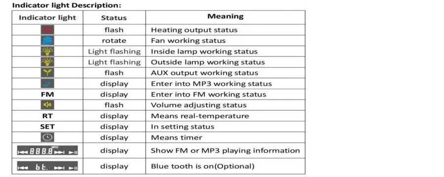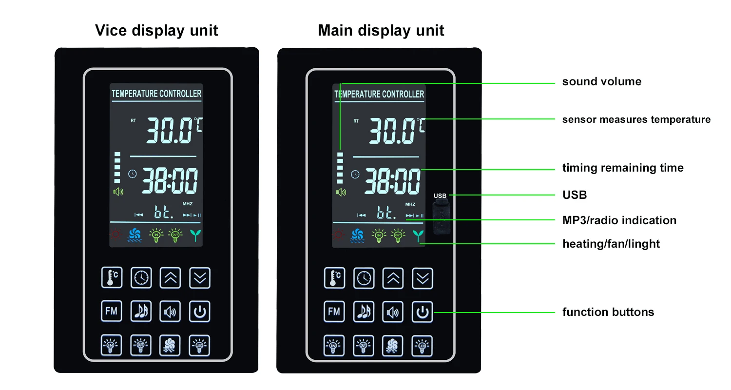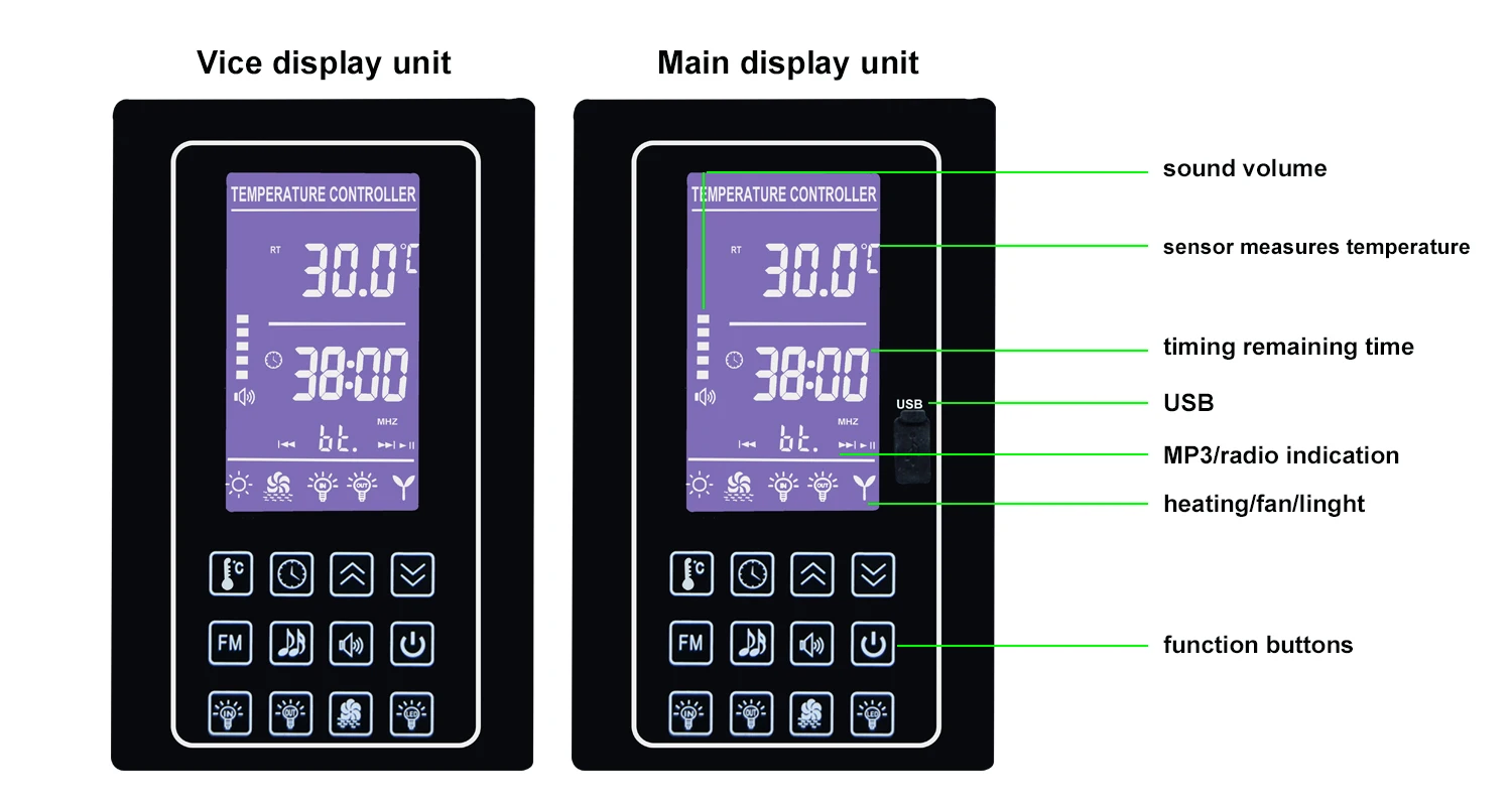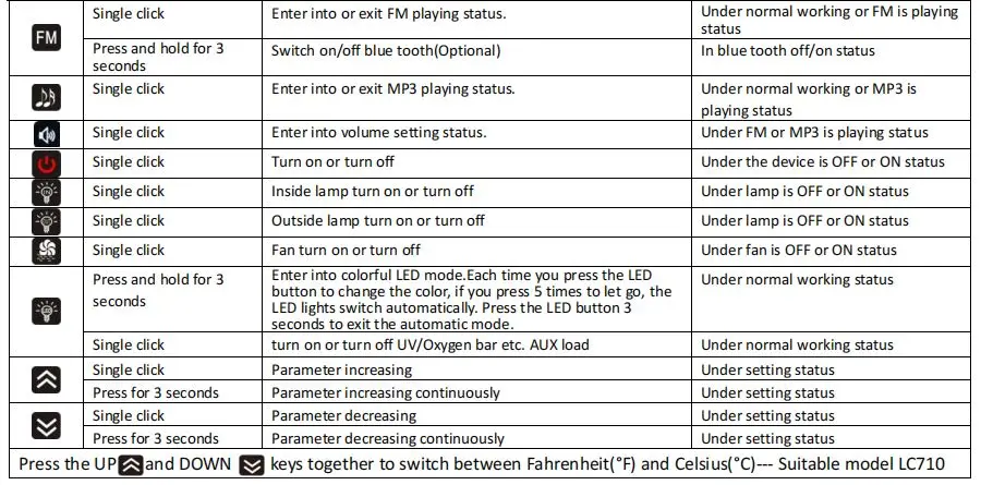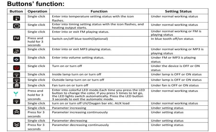 5.Multi fonctions: chaleur, mp3, FM, lumière intérieure et extérieure, LED de thérapie de couleur à bord, ventilateur, AUX (barre UV/oxygène, etc.)