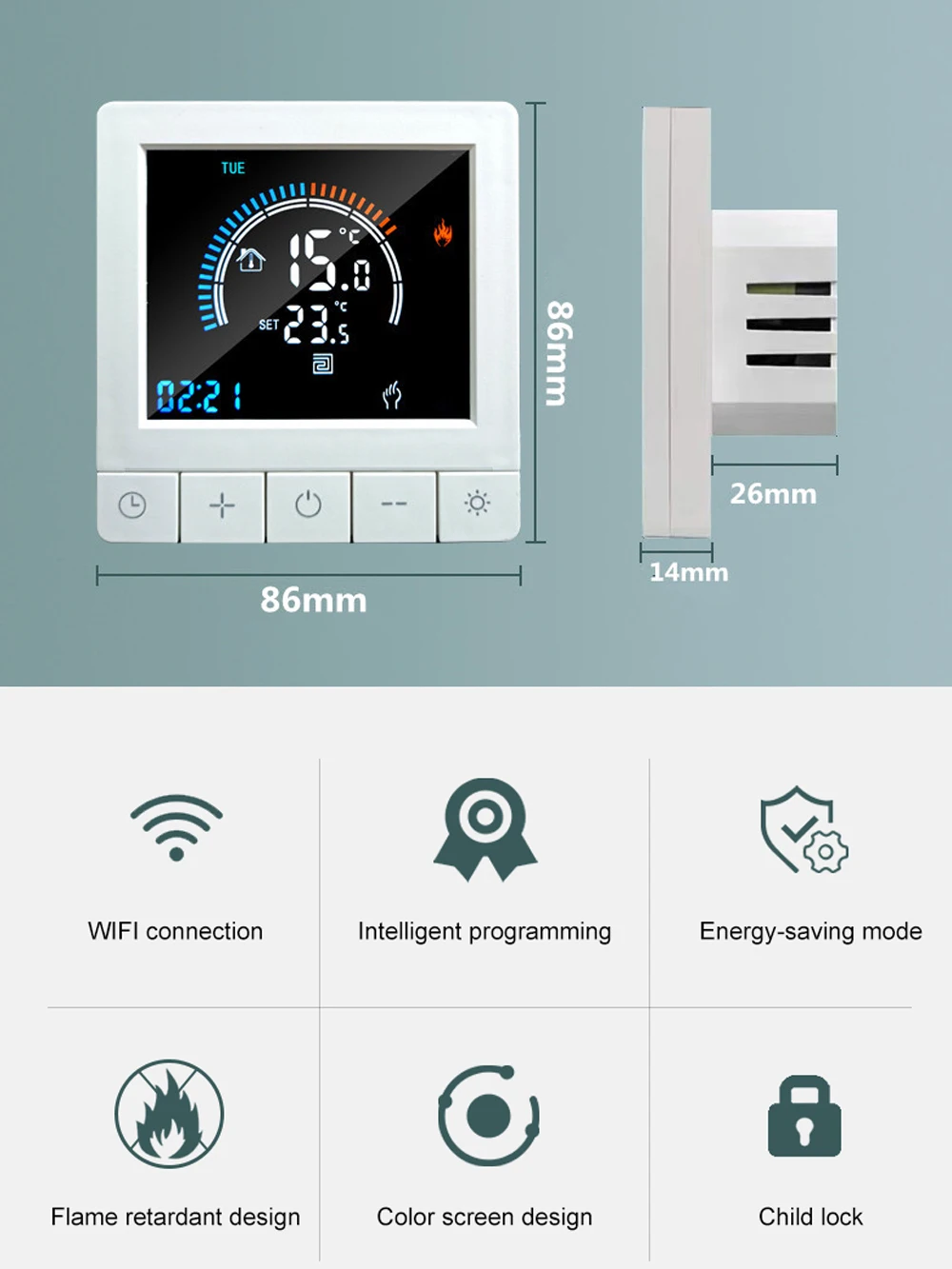 Thermostat WiFi avec régulateur de température pour maison intelligente, pour chauffage au sol et AC, avec batterie de secours et outils de verrouillage intelligents pour enfantsThermostat WiFi avec régulateur de température pour maison intelligente, pour chauffage au sol et AC, avec batterie de secours et outils de verrouillage intelligents pour enfants