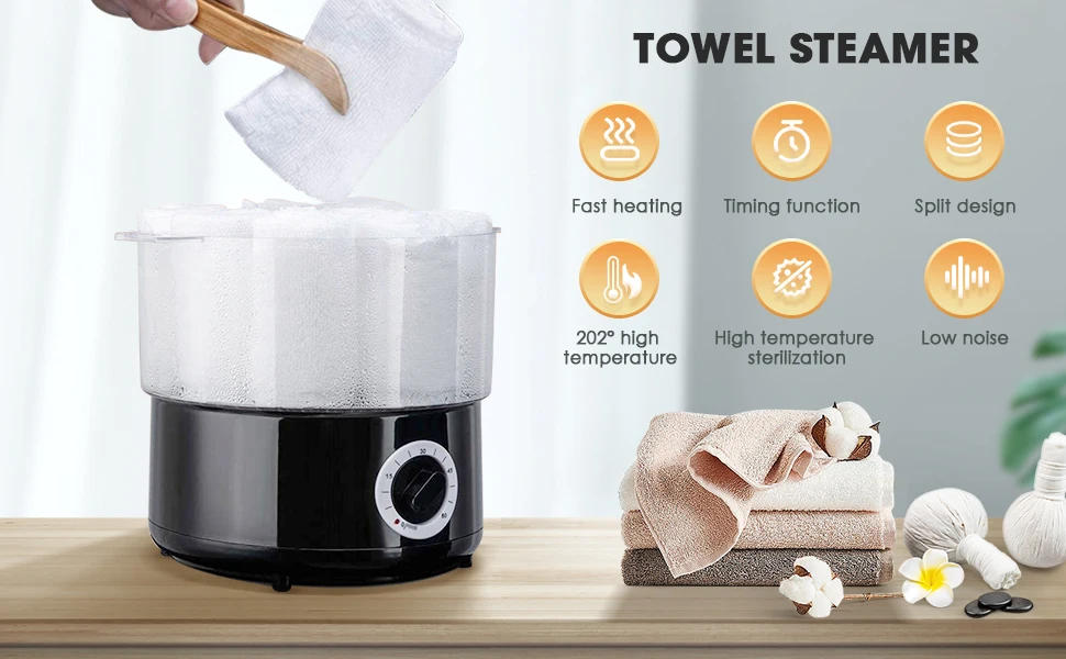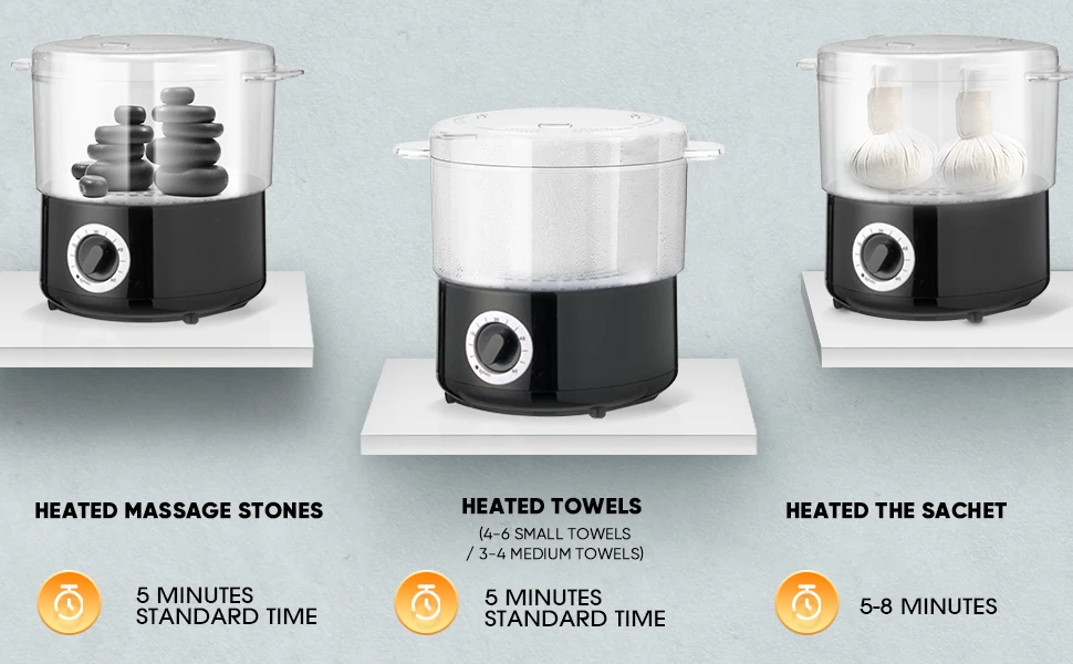 ☀Stérilisation à la vapeur naturelle: utilisez la stérilisation à la vapeur à haute température pour tuer la plupart des bactéries nocives. Vous pouvez chauffer des pierres de massage (5 minutes d’heure standard), chauffer des packs d’aromathérapie (5-8 minutes), et serviettes chaudes (le porte-serviettes peut contenir 4-6 petites serviettes ou 3-4 serviettes moyennes).☀Remarque: lorsque vous l’utilisez, veuillez ne pas ajouter d’autres réactifs contenant des ingrédients chimiques, tels que de l’alcool, etc., pour éviter d’endommager le couvercle en plastique.