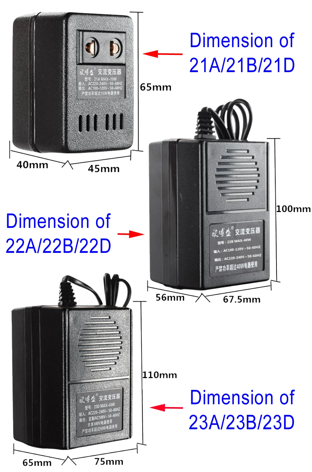 Modèle 22A : 40W, entrée 220V~240Vac, sortie 100V~120Vac