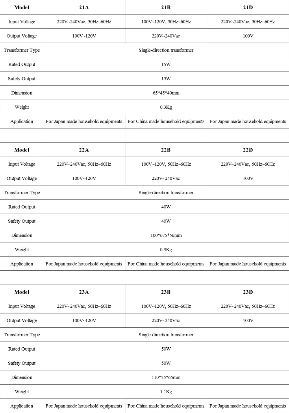 Modèle 23A : 50 W, entrée 220 V ~ 240 V CA, sortie 100 V ~ 120 V CA.