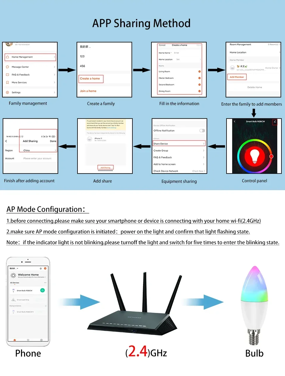 4. Ouvrez l’APP — Cliquez « + » pour ajouter un appareil— Cliquez sur « la lumière est clignotante » —- choisir le réseau contient ‘2.4G’ au lieu de ‘5G’ —- entrer le mot de passe et entrer — Clic « connexion » — sélectionnez le réseau « TUYA smart » — cliquez sur « next pas » attendre jusqu’à entièrement connecté — Cliquez sur l’appareil « lumière » — Cliquez « mon appareil » et sélectionnez-le.