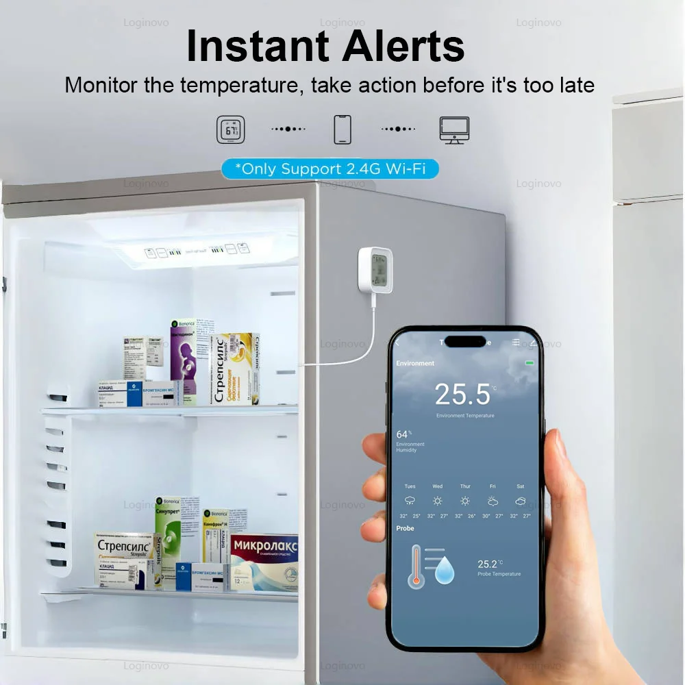Découvrez notre thermomètre intelligent avec sonde externe!Il est conçu pour vous faciliter la vie grâce à un capteur externe pratique qui peut vérifier la température dans des endroits comme votre réfrigérateur, votre congélateur ou votre aquarium – plus de stress sur les endroits restreints.