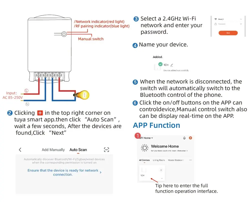 Tension d’entrée AC 85-250V Tension de sortie du commutateur intelligent AC 85-250V.