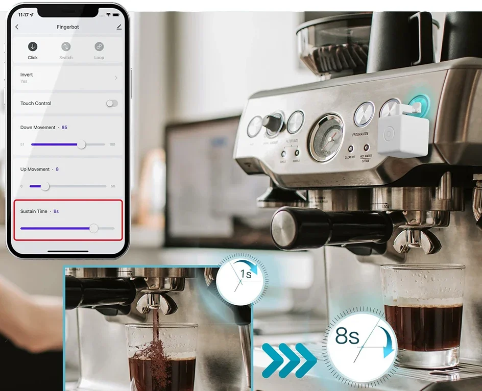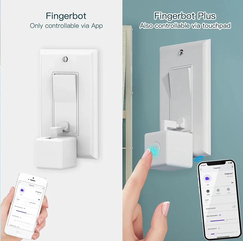 4. Fingerbot Plus est compatible avec divers boutons et commutateurs. Il peut simplement coller à n’importe quelle surface et moderniser votre ancien appareil. Si vous l’avez installé dans la direction opposée, ne vous inquiétez plus à ce sujet, l’option de commutateur inversé est disponible dans l’application pour ajuster sa position où que vous soyez, assurer votre vie avec gain de temps et économie d’énergie pour la surveillance du niveau de batterie en temps réel. Vous pouvez l’utiliser pour vos lumières, ventilateurs, cafetières, porte de garage, etc. Avec l’add-on, un interrupteur à bascule peut être retourné dans les deux sens, pousser ou tirer pour ON/OFF par un seul Fingerbot Plus.