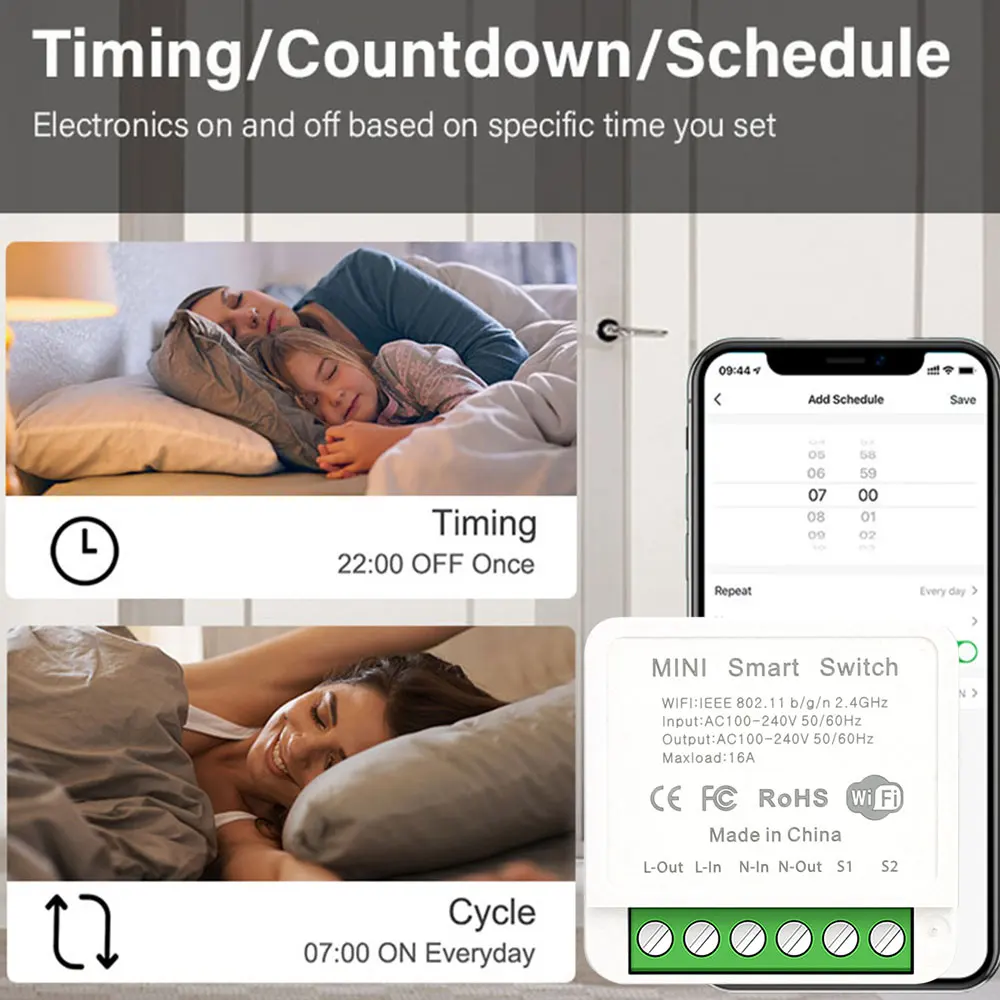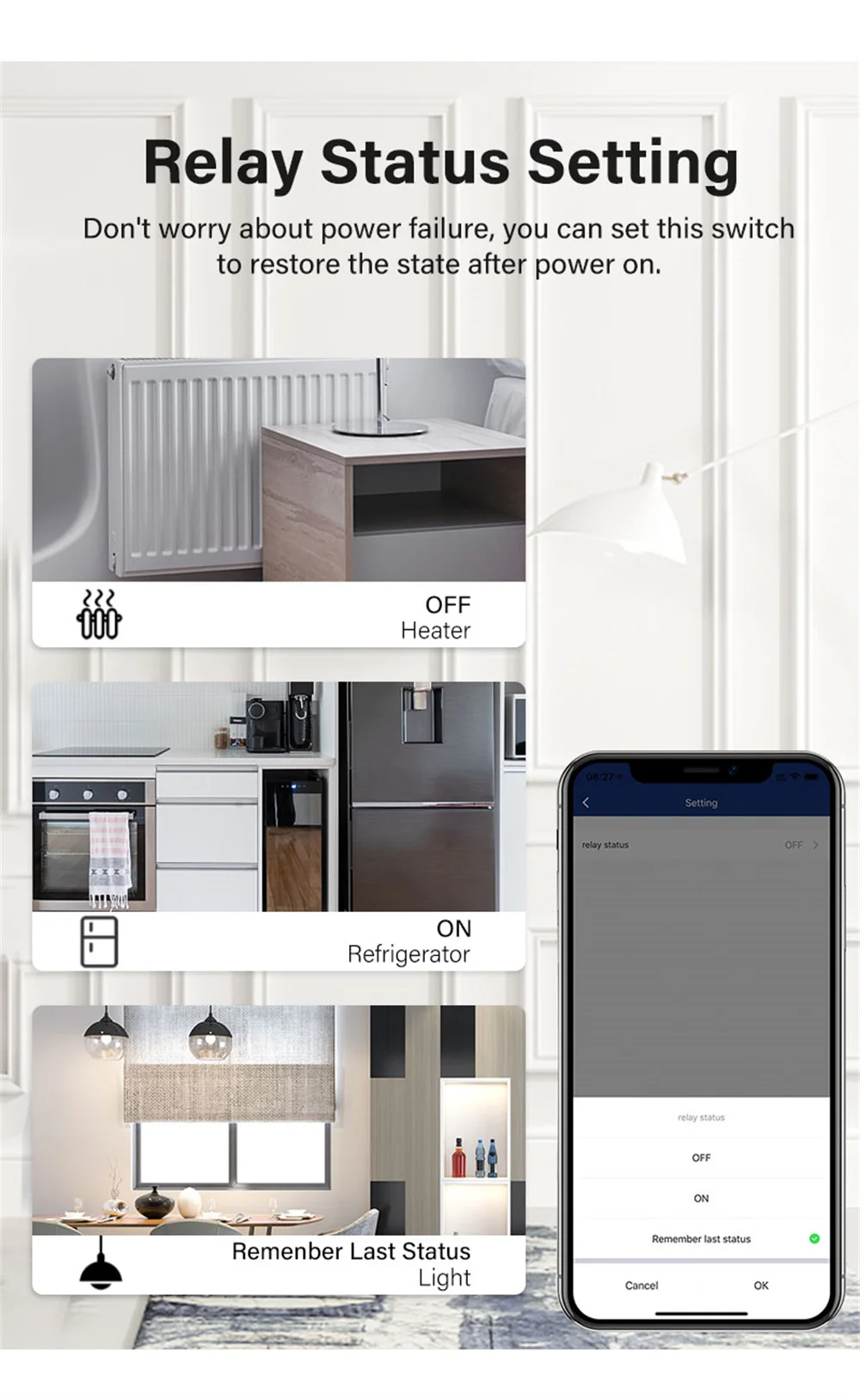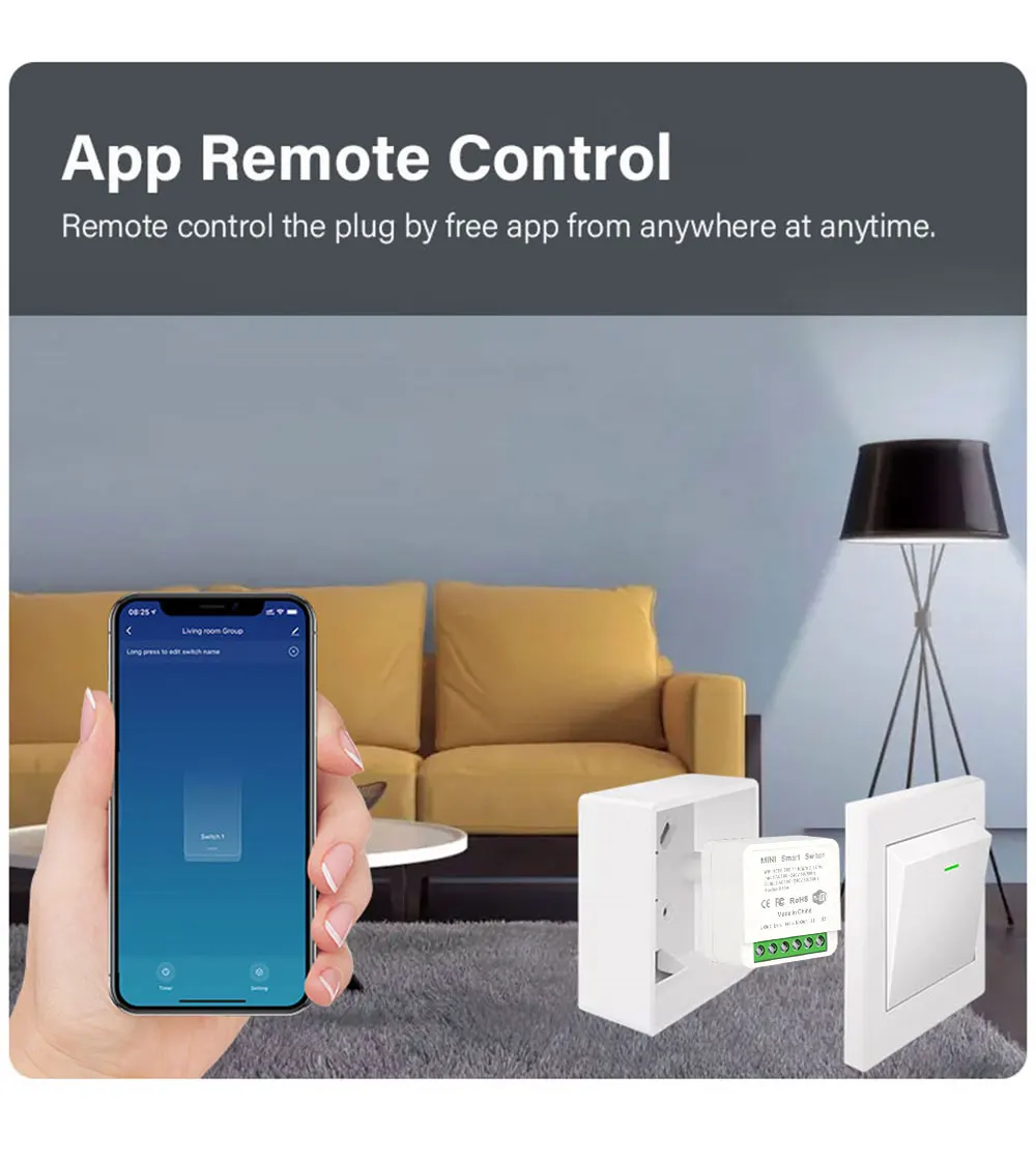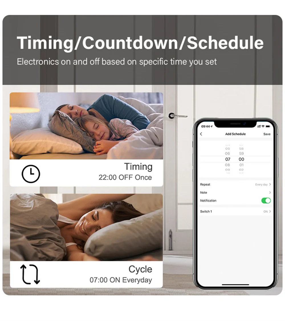 Vous pouvez contrôler l’interrupteur, la synchronisation, le compte à rebours et d’autres fonctions de l’appareil via votre téléphone portable. Cela peut être commandé: éteindre les lumières dans le salon après 2 heures. 18:15 Éteignez le four. Allumez la chaudière à 21:00. Vous pouvez également chronométrer l’appareil lorsque vous n’êtes pas à la maison. (APPLICATION: Smart Life/TUYA Smart)
