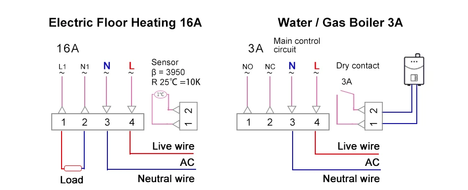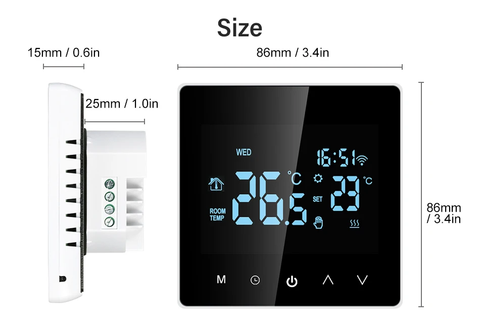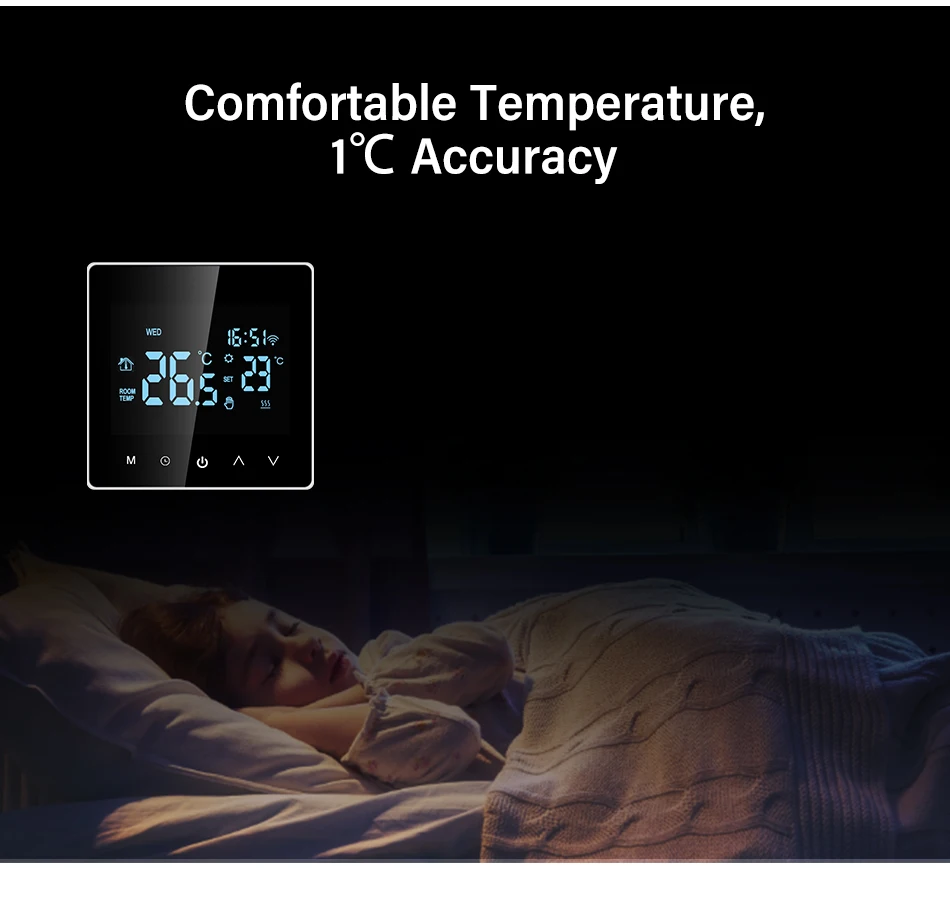 Consommation électrique:<1W Tension: AC 110-230V 50/60Hz Courant de charge: 3A/16A Réglage de la température: 5-90 ℃ Clé: Touche tactile Télécommande App En utilisant votre smartphone ou votre tablette, contrôlez à distance le thermostat wifi intelligent grâce à l’application gratuite Smart Life ou TuyaSmart depuis n’importe où et à tout moment. Commande vocale Le thermostat wifi intelligent est parfaitement compatible avec Amazon Alexa, Google Home, Yandex Alice. Il suffit de donner une commande vocale à votre Yandex Alice,Alexa ou Google Home Assistant pour contrôler vos appareils lorsque vous êtes en déplacement. Écran tactile LCD Grand écran tactile LCD avec rétro-éclairage, facile à lire. Aspect élégant, design à face unique, anti-rayures. Température précise Capteur interne capteur de sol, température ambiante perceptive et température du sol. Obtenez automatiquement la température, précision de 1 °C. Hebdomadaire programmable Le thermostat prend en charge différents réglages de température en conséquence avec 6 modes horaires quotidiens. Fonction mémoire Pas besoin de s’inquiéter de la panne de courant, mémoire de données lorsque l’alimentation est coupée. Serrure pour enfants La fonction de verrouillage du clavier est conçue pour empêcher les enfants de fonctionner par erreur. Application Convient pour le chauffage électrique/chaudière à gaz/chauffage de l’eau. Parfait pour la maison, le bureau, le centre commercial, l’hôtel, etc. Remarque: Seul le thermostat 16A (versions WIFI et NO WIFI) comprend un câble de détection de température externe.
