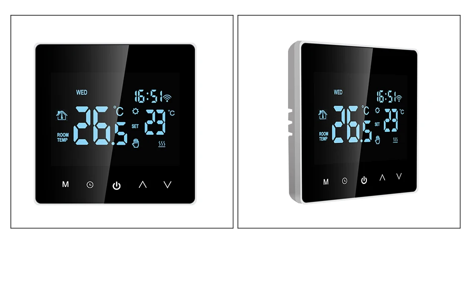 Consommation électrique:<1W Tension: AC 110-230V 50/60Hz Courant de charge: 3A/16A Réglage de la température: 5-90 ℃ Clé: Touche tactile Télécommande App En utilisant votre smartphone ou votre tablette, contrôlez à distance le thermostat wifi intelligent grâce à l’application gratuite Smart Life ou TuyaSmart depuis n’importe où et à tout moment. Commande vocale Le thermostat wifi intelligent est parfaitement compatible avec Amazon Alexa, Google Home, Yandex Alice. Il suffit de donner une commande vocale à votre Yandex Alice,Alexa ou Google Home Assistant pour contrôler vos appareils lorsque vous êtes en déplacement. Écran tactile LCD Grand écran tactile LCD avec rétro-éclairage, facile à lire. Aspect élégant, design à face unique, anti-rayures. Température précise Capteur interne capteur de sol, température ambiante perceptive et température du sol. Obtenez automatiquement la température, précision de 1 °C. Hebdomadaire programmable Le thermostat prend en charge différents réglages de température en conséquence avec 6 modes horaires quotidiens. Fonction mémoire Pas besoin de s’inquiéter de la panne de courant, mémoire de données lorsque l’alimentation est coupée. Serrure pour enfants La fonction de verrouillage du clavier est conçue pour empêcher les enfants de fonctionner par erreur. Application Convient pour le chauffage électrique/chaudière à gaz/chauffage de l’eau. Parfait pour la maison, le bureau, le centre commercial, l’hôtel, etc. Remarque: Seul le thermostat 16A (versions WIFI et NO WIFI) comprend un câble de détection de température externe.