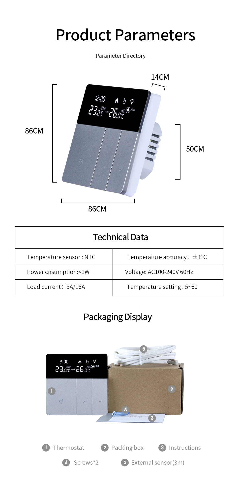 En raison du thermostat avec miroir en verre, la couleur peut changer dans un environnement différent. Lorsque vous l’installez sur le mur et que vous l’allumez, il changera de noir foncé.