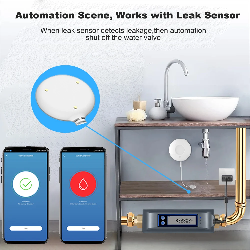 Scènes automatisées à utiliser avec les détecteurs de fuite d’eau : à travers l’application Tuya, les utilisateurs peuvent configurer les scènes pour travailler avec le détecteur de fuite d’eau WiFi Tuya (vendu séparément), tels qu’arrêt automatiquement une valve