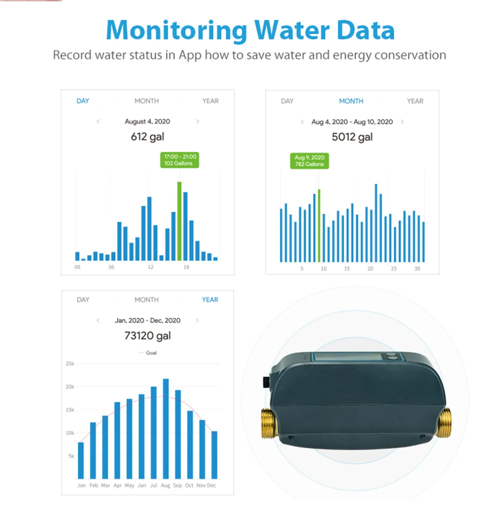 Compteur d’eau intelligent : moniteur d’utilisation de l’eau avec les statistiques quotidiennes, mensuelles et dernières usages, vous aider