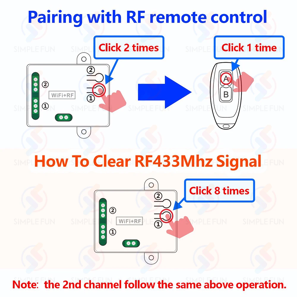 Press the pairing button « ① » 8 times ,After delete the signal, all relays will not be controllable by the remote control,