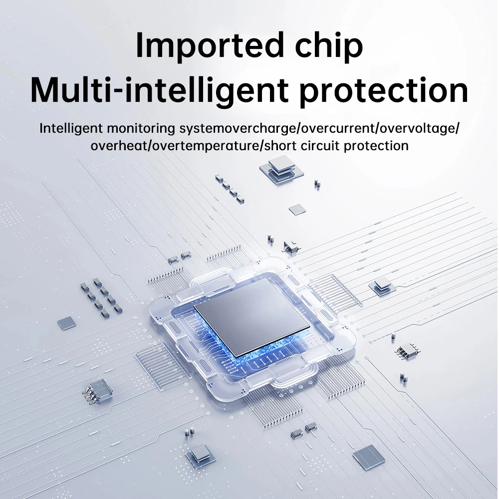 3.Puce intelligente intégrée, détecte automatiquement les appareils connectés, optimise la distribution d’énergie et dispose d’une fonction de rappel de faible puissance pour gérer efficacement la consommation d’énergie.