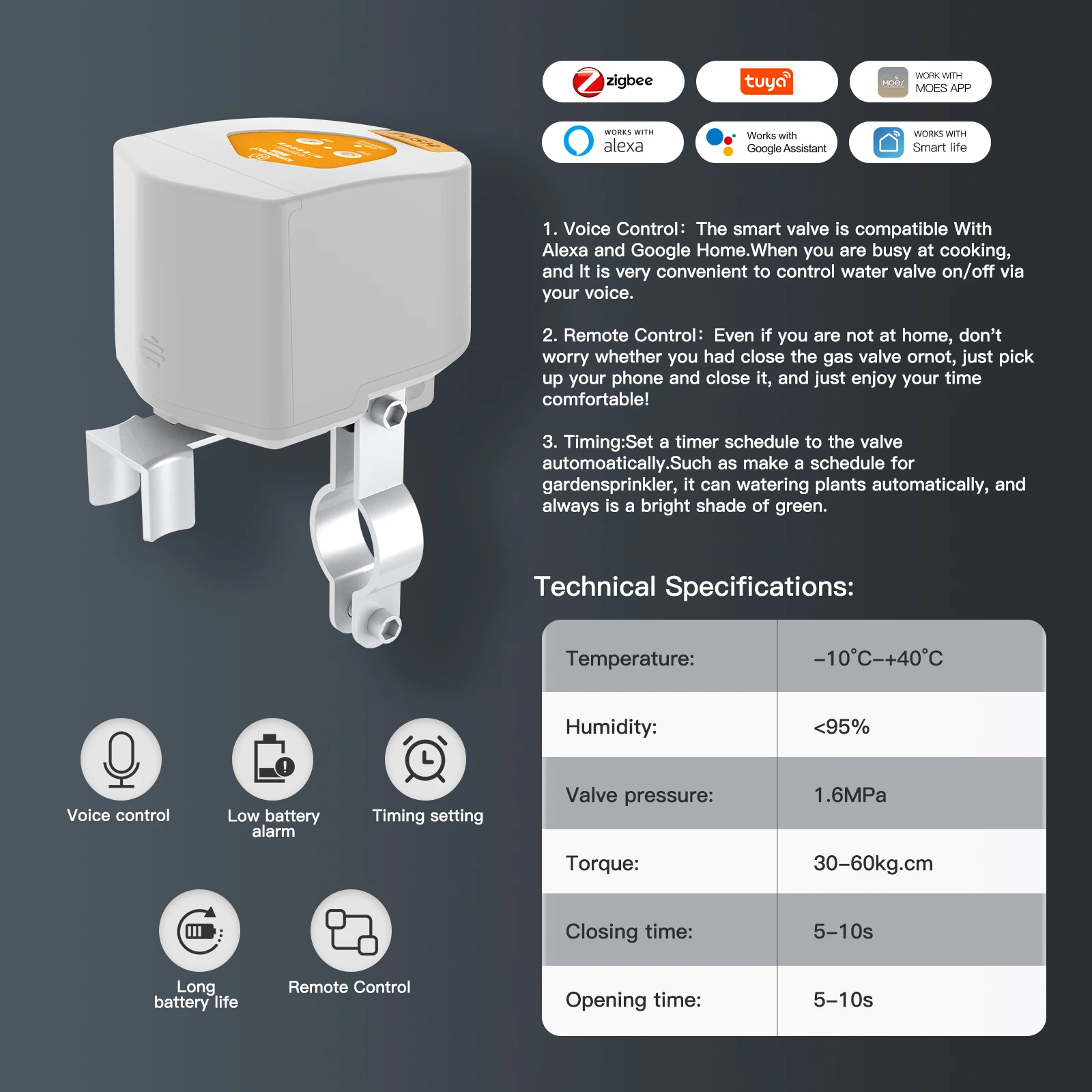 📱 Télécommande APP : vous pouvez connecter l’appareil au WIFI (Wi-Fi 2,4 GHz) via l’application « Smart Life » ou « Tuya Smart » gratuite. Pas de matière où vous êtes, vous pouvez utiliser votre smartphone pour contrôler l’ouverture ou la fermeture de la valve d’eau.