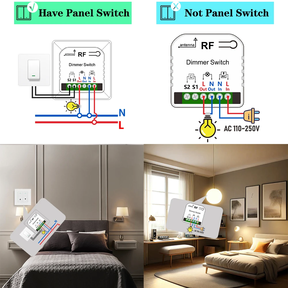 Le variateur doit être utilisé avec la télécommande pour obtenir l’effet de contrôle.Si vous achetez un variateur ou une seule télécommande, veuillez vous assurer que vous avez un autre variateur ou une télécommande, sinon l’effet de contrôle de gradation ne peut pas être acheté.