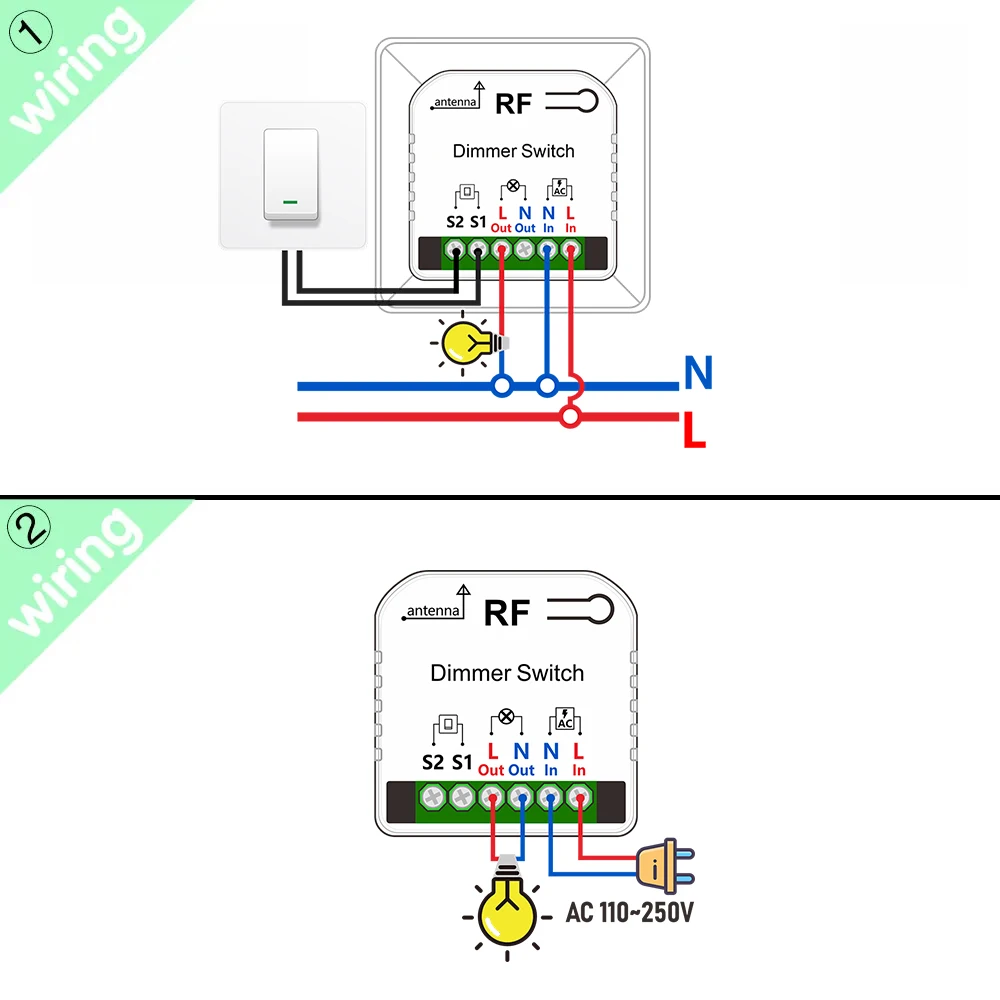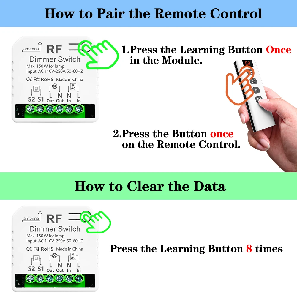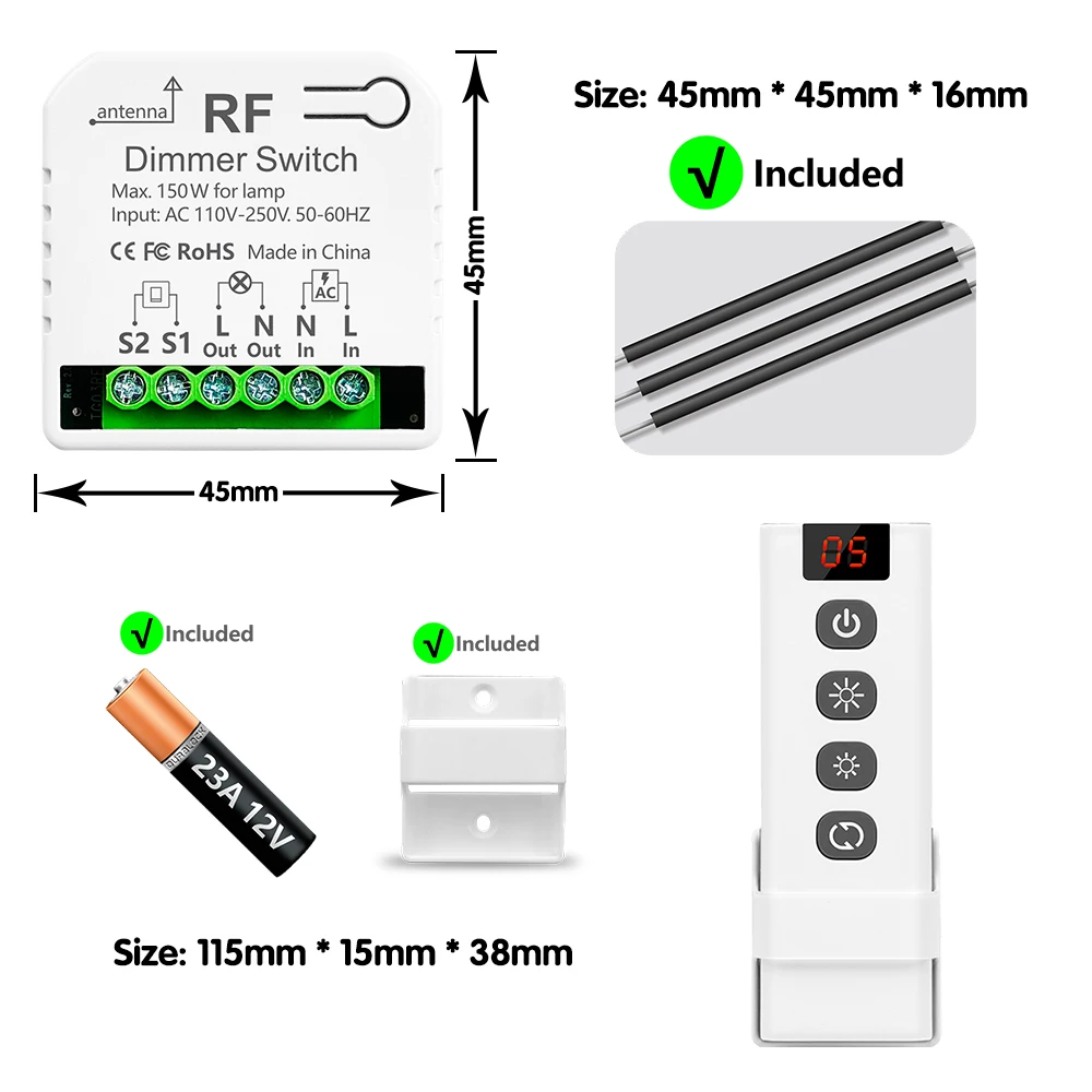 Le variateur doit être utilisé avec la télécommande pour obtenir l’effet de contrôle.Si vous achetez un seul variateur ou une seule télécommande, assurez-vous d’avoir un autre variateur ou une télécommande, sinon l’effet de contrôle de gradation ne pourra pas être obtenu.