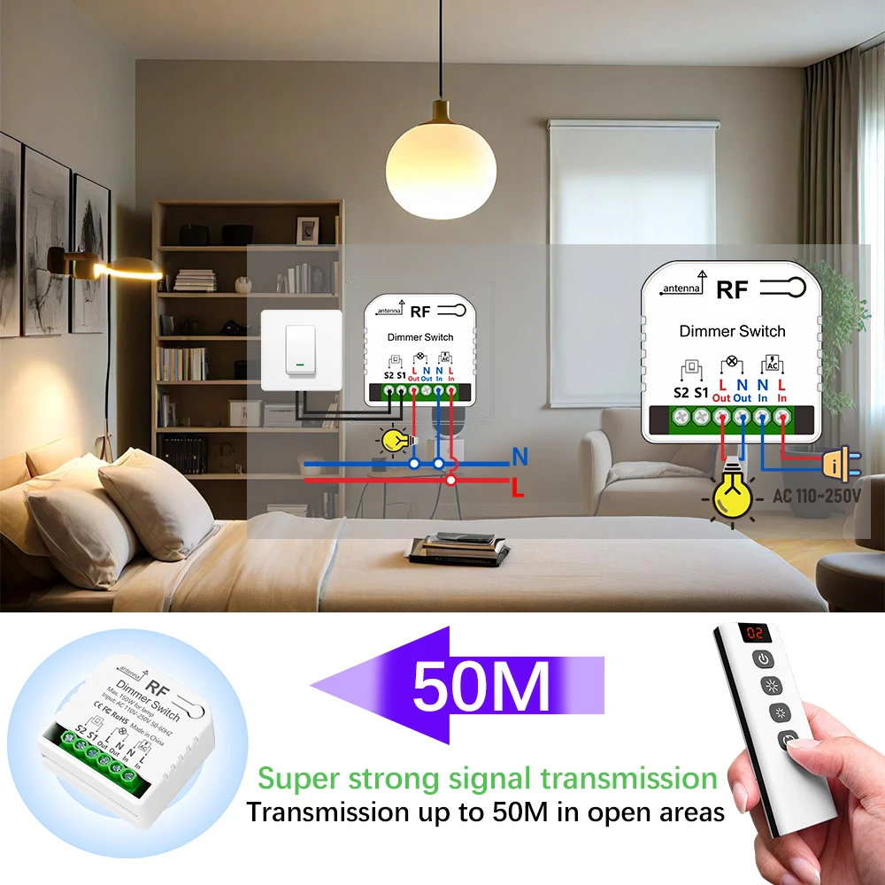 Le variateur doit être utilisé avec la télécommande pour obtenir l’effet de contrôle.Si vous achetez un seul variateur ou une seule télécommande, assurez-vous d’avoir un autre variateur ou une télécommande, sinon l’effet de contrôle de gradation ne pourra pas être obtenu.