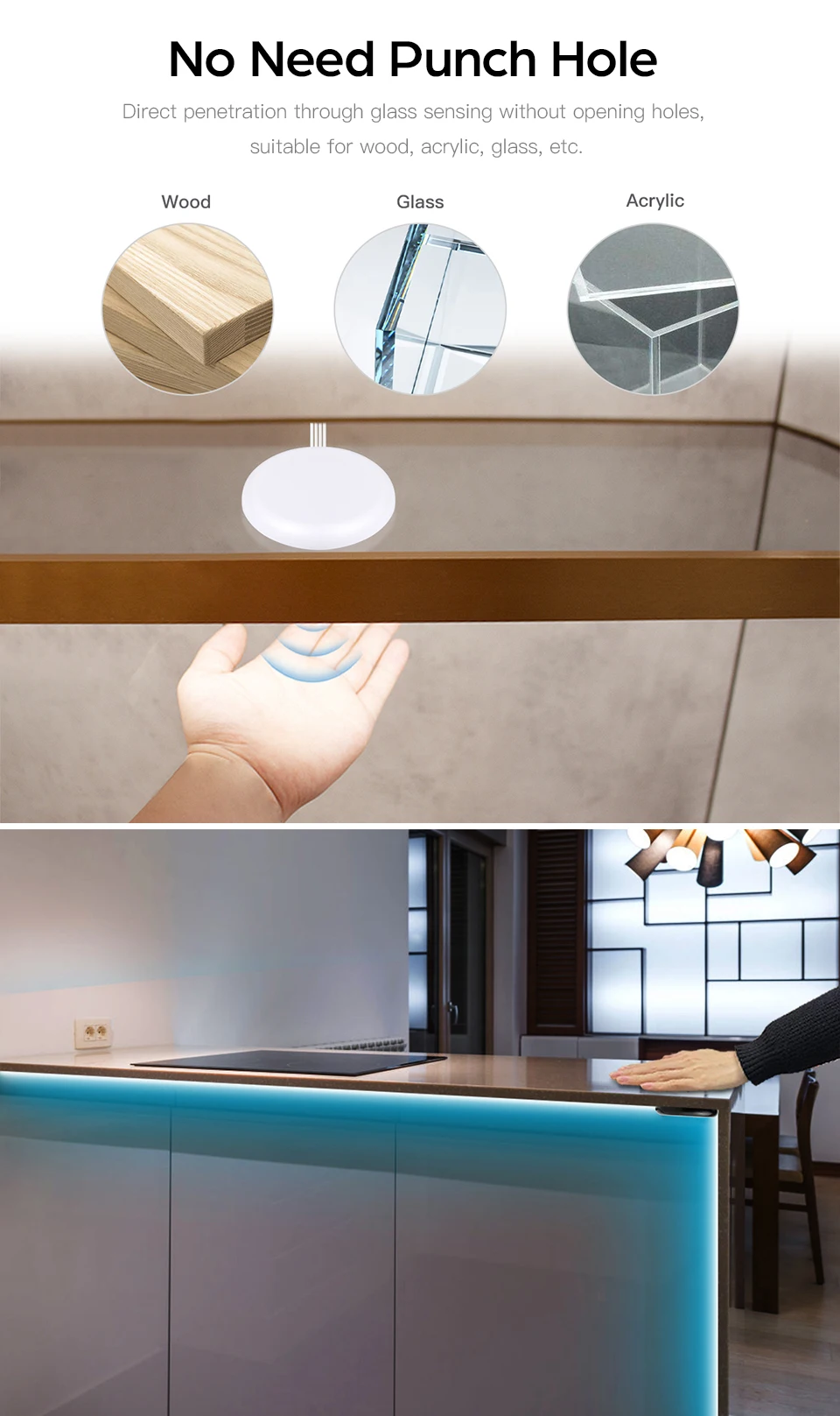 1.L’interrupteur de capteur de commande de variateur tactile intelligent est utilisé derrière le panneau de bois (like l’armoire de cuisine, l’armoire, l’armoire, l’armoire..) ou le miroir en verre. Il peut fonctionner sur la lumière LED DC 12V, et il plus flexible pour coller n’importe où vous aimez, simple et facile à installer. N’a pas besoin de trous ouverts!! !