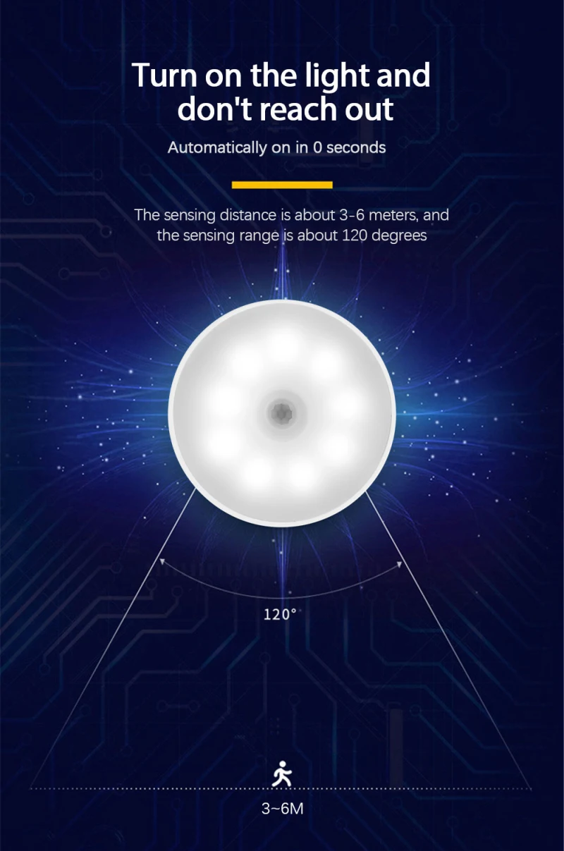 4.Capteur de corps humain quand le corps humain entre dans la gamme de détection dans 3-5m dans l’environnement sombre, la lumière s’allumera et continuera à allumer la lumière et à éteindre automatiquement la lumière après avoir quitté 20S, dans l’environnement lumineux, la lumière de nuit entrera automatiquement dans l’état de sommeil.