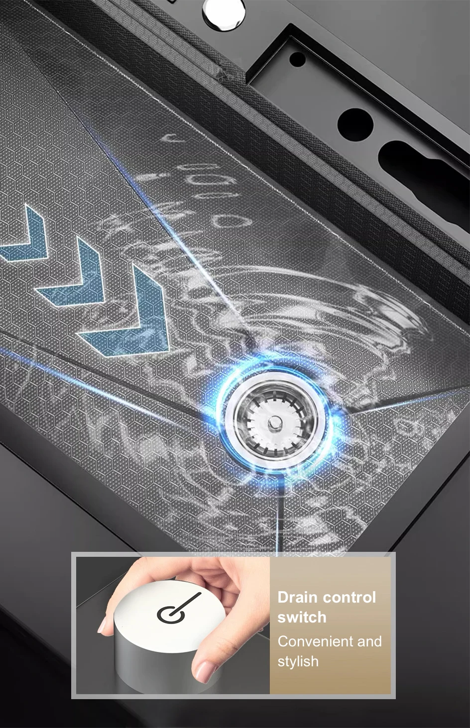 Drainage à commande à une touche, le drainage fluide n’est pas facile à bloquer, l’intérieur de l’évier n’est pas facile à accumuler l’eau et le drainage est plus rapide.