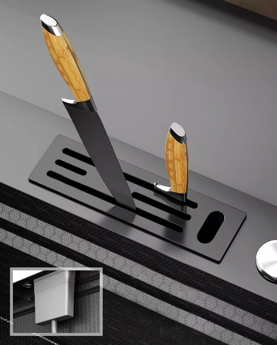 Le porte-couteau a 5 trous pour répondre à la plupart des besoins du rangement des couteaux de cuisine et est équipé d’un drainage indépendant.