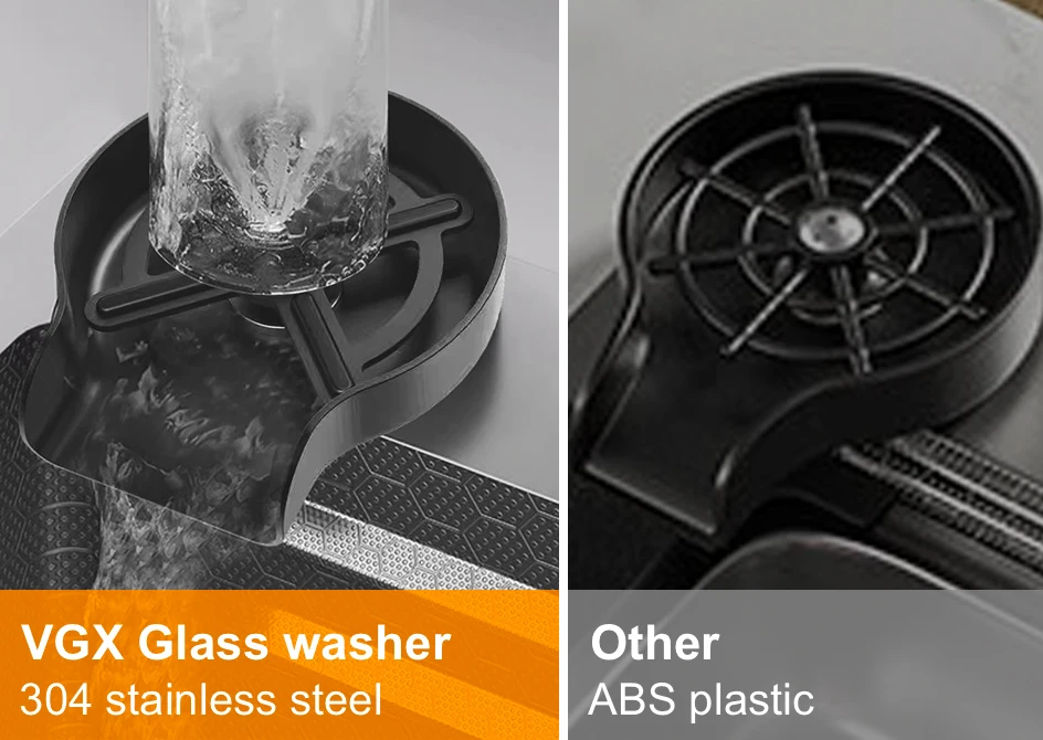 Le lave-gobelet VGX est fabriqué en acier inoxydable 304, qui n’est pas facile à rouiller, à usurer et à fissurer ; Les autres lave-gobelets d’évier sur le marché sont fabriqués en plastique ABS, qui ne peut pas être utilisé pendant une longue période, et est facile à reproduire des bactéries et à l’usure.