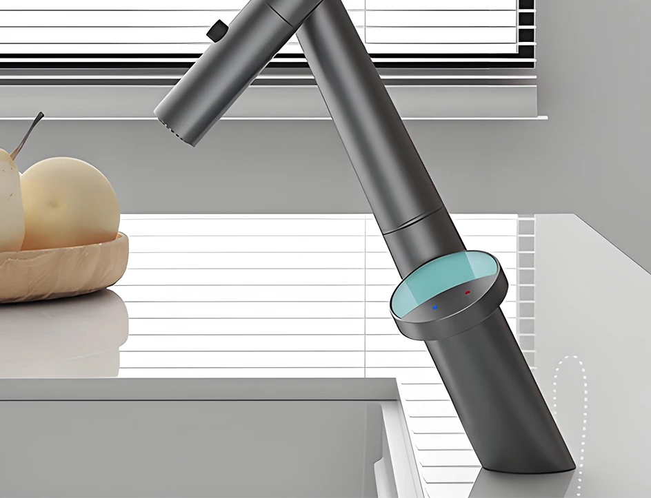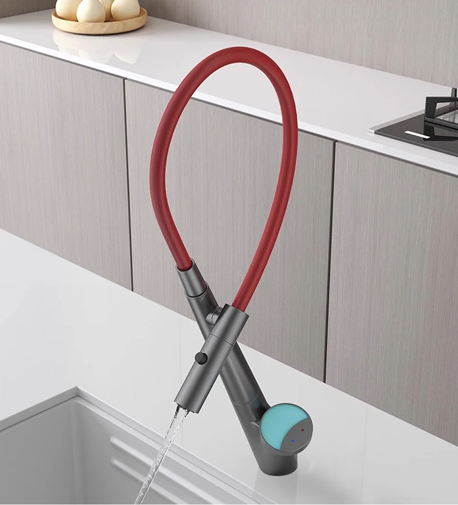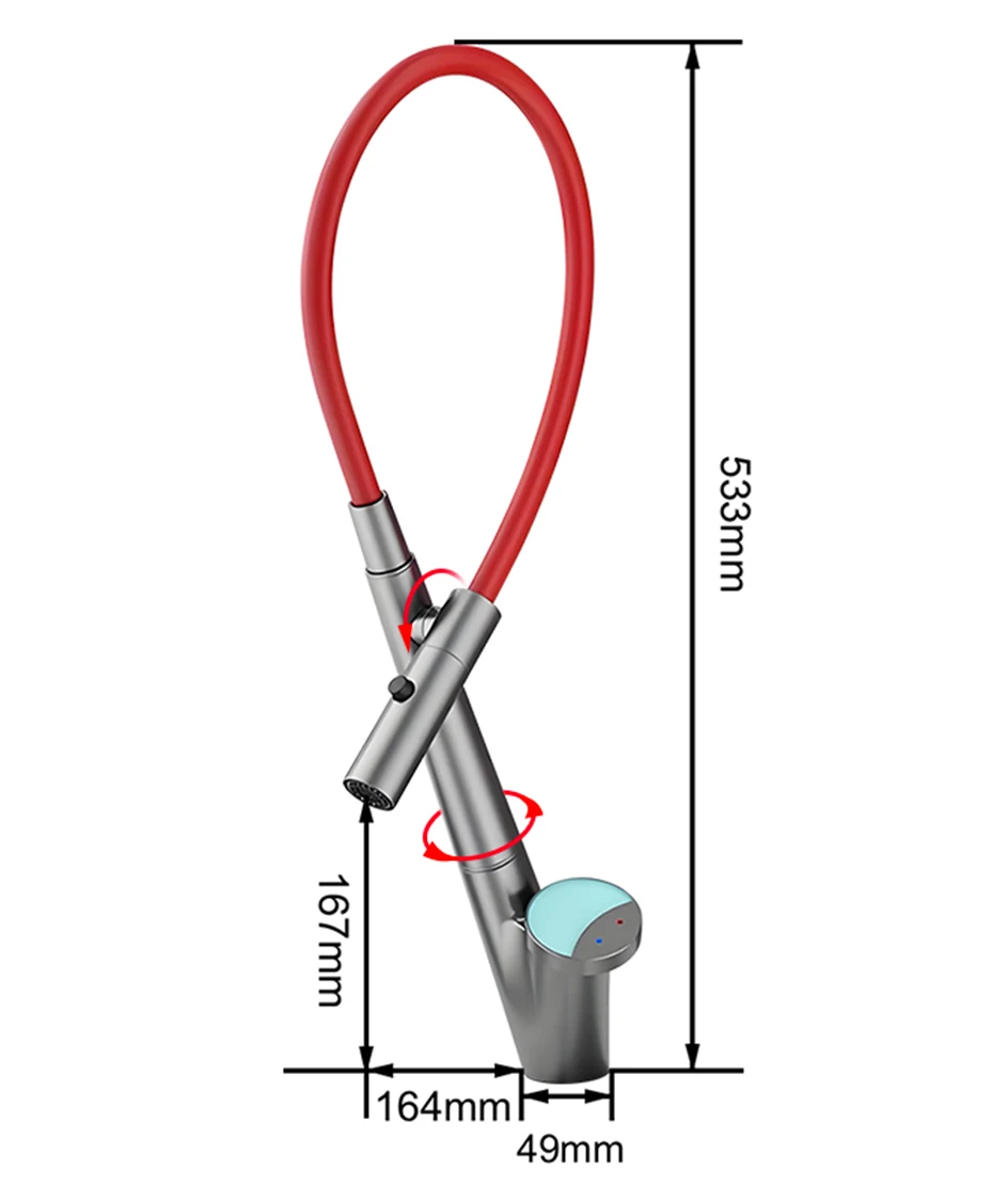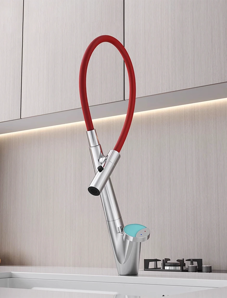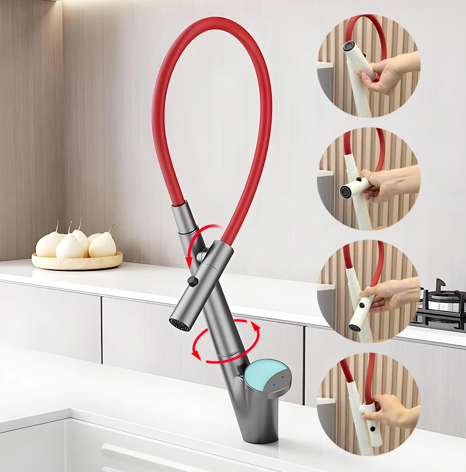 Le corps du tuyau peut pivoter librement à 360 degrés, combiné à la fonction d’extraction, pour répondre aux besoins d’admission d’eau dans plusieurs directions, libérant ainsi de l’espace dans l’évier.