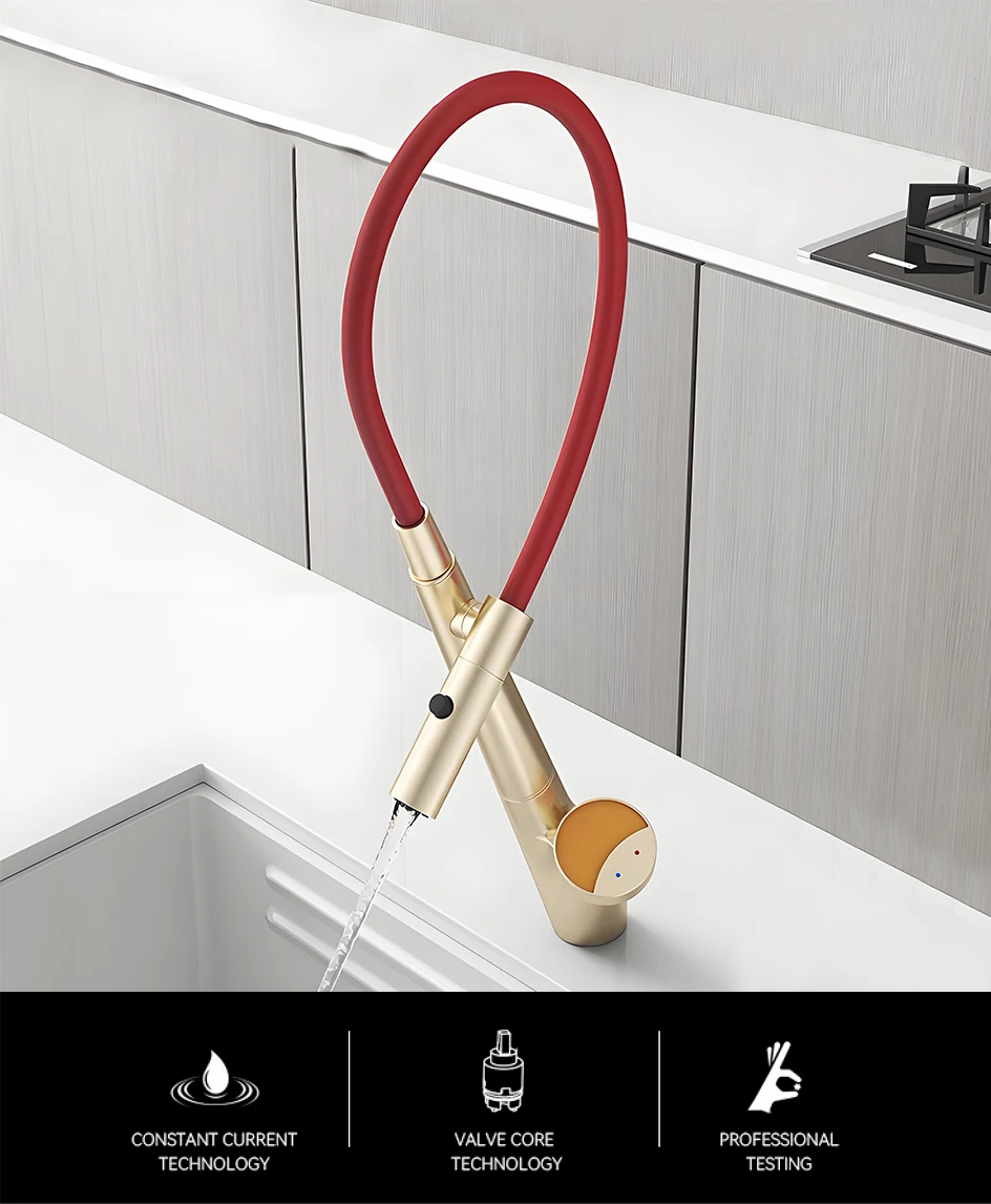 【Conception courbée en silicone PEX】 Équipé d’un coude en silicone PEX de qualité alimentaire, d’une résistance aux températures élevées et d’une forte flexibilité, il prend en charge 360°° rotation extractible, couvre facilement tous les coins de l’évier et évite les points douloureux des tuyaux traditionnels qui vieillissent et fuient facilement.