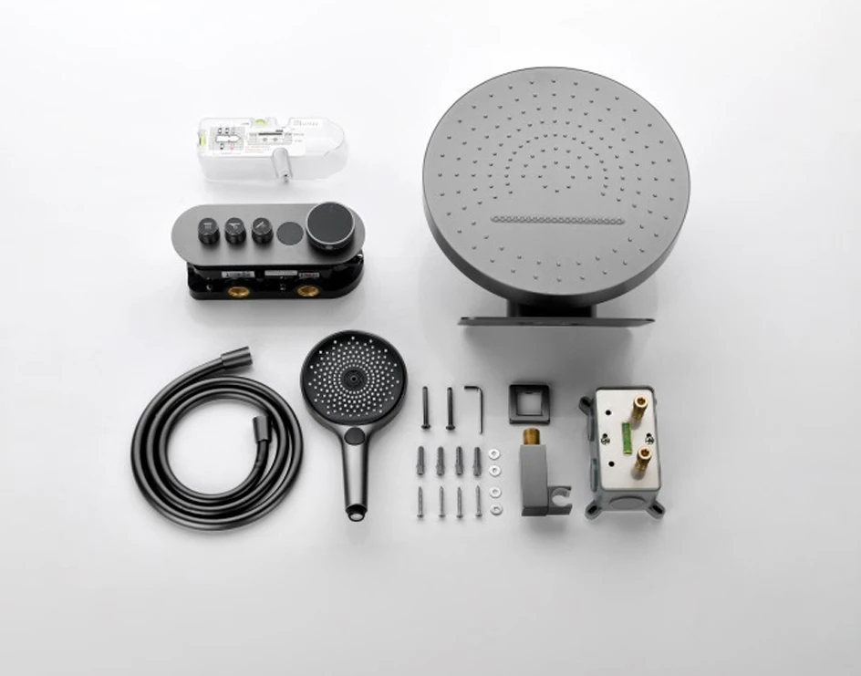 【Construction entièrement en métal】 Le mitigeur thermostatique est en laiton massif, toutes les autres pièces de cet ensemble de robinets de douche sont en acier inoxydable SUS, et la finition noire mate assure une utilisation durable.
