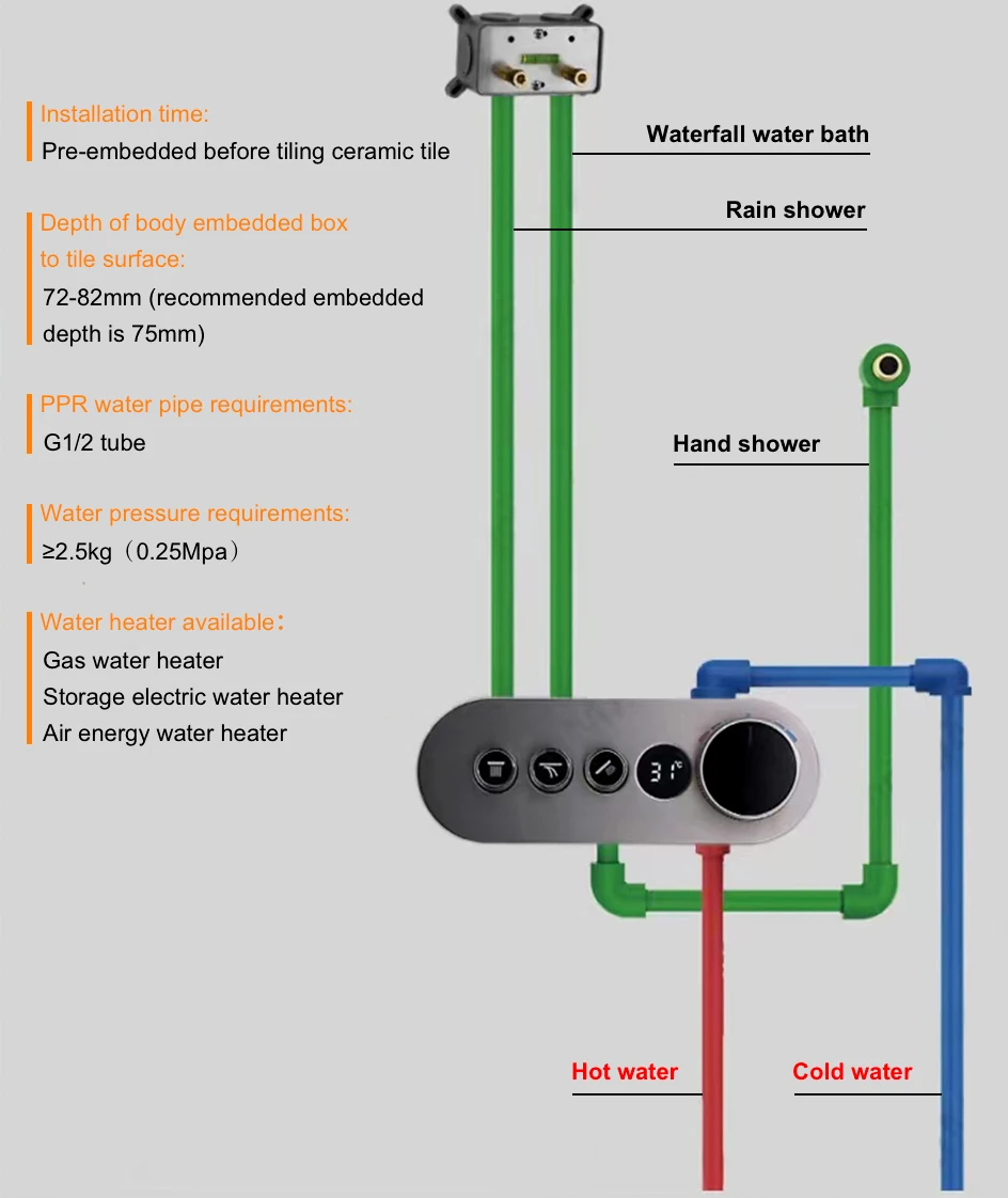 【Connexion standard G1/2 »NPT 】Les connecteurs sont des filetages coniques standard NPT 1/2 », compatibles avec la plupart des systèmes de douche existants. La boîte intégrée et tous les matériels et pièces sont inclus facilite l’installation.