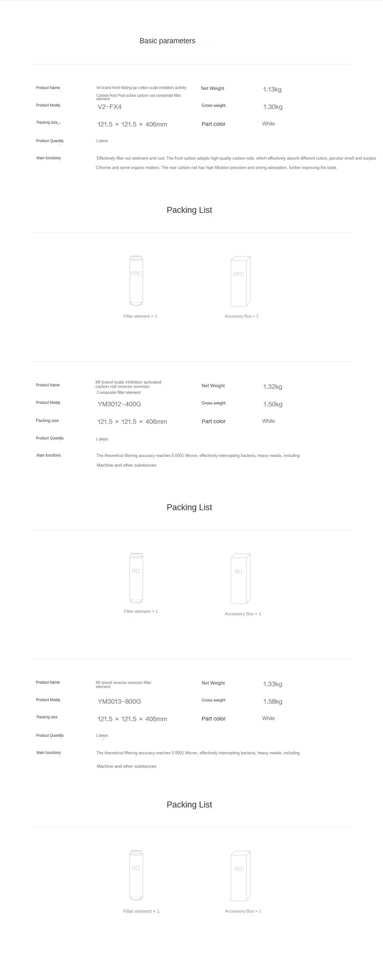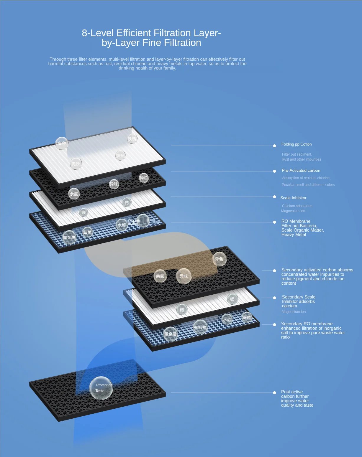 Fonctions principales: filtrer efficacement les sédiments et la rouille; Le carbone avant adopte des tiges de carbone de haute qualité, qui peuvent absorber efficacement différentes couleurs, odeurs, chlore résiduel et certaines substances organiques; les tiges de carbone arrière ont une grande précision de filtration et une forte capacité d’adsorption, ce qui améliore encore le goût.