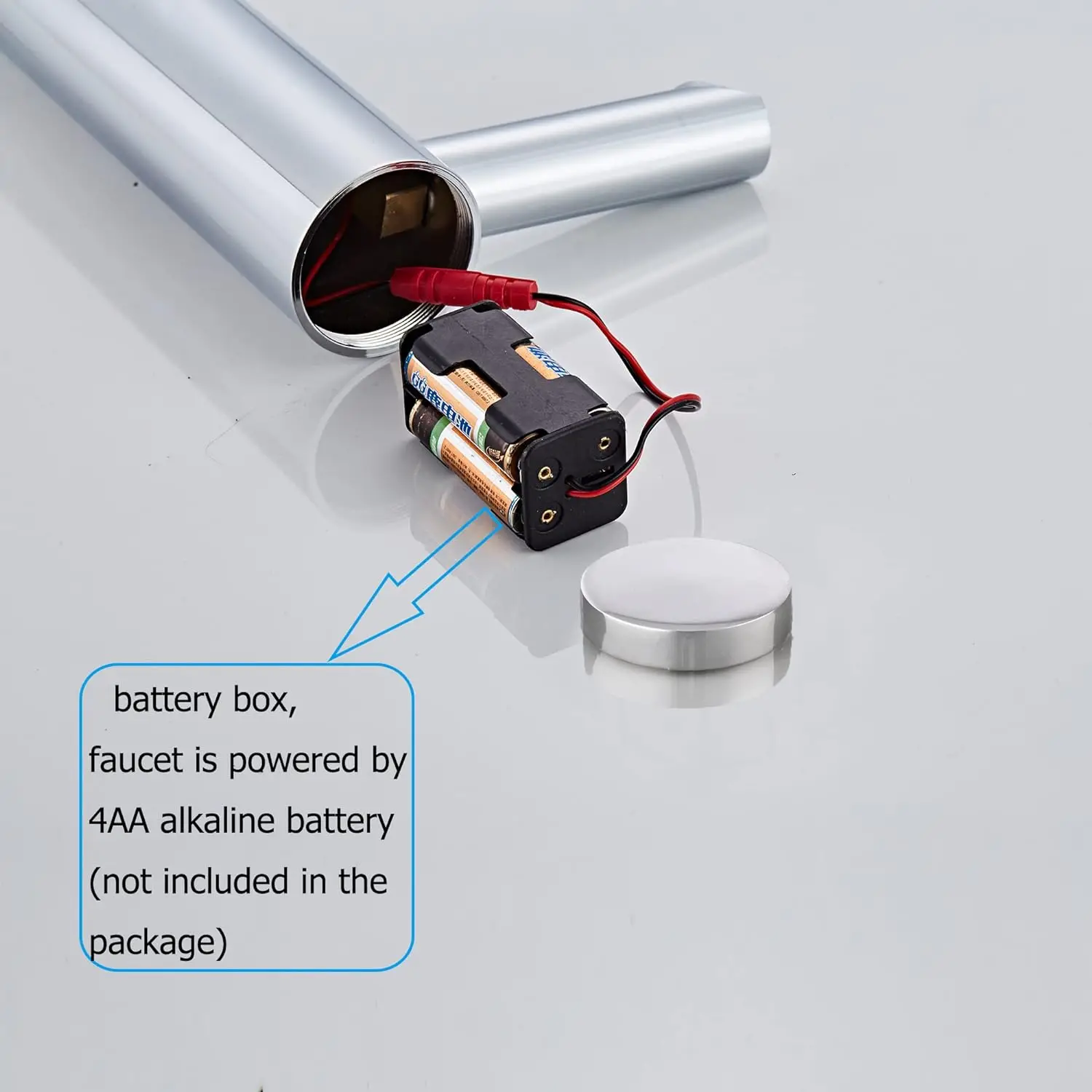 Puissance : capteur alimenté par des piles alikaline 4AA (non incluses) qui peuvent durer 2 ans pour une utilisation familiale. Les piles doivent être installées dans le boîtier de batterie (sur le dessus du corps du robinet). Vous devez préparer des piles 4AA dans l’avance.