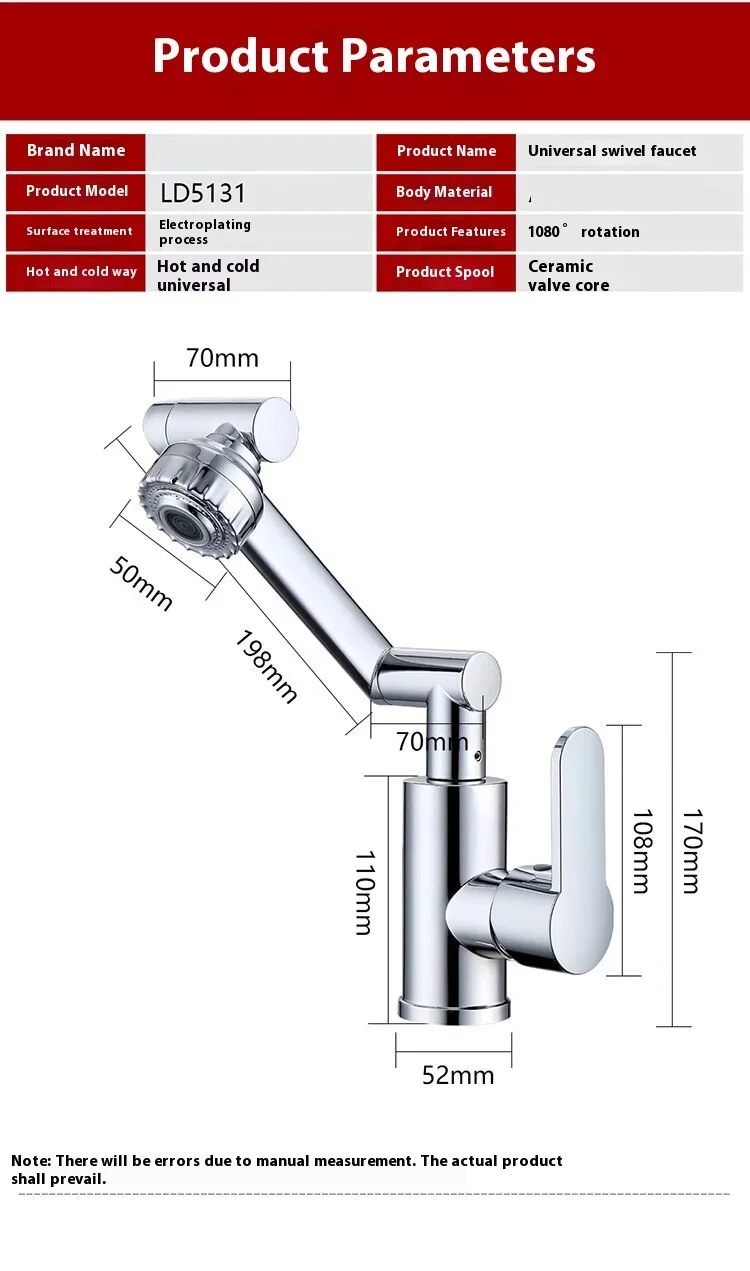 Dimensions : hauteur du bec 8,3″, portée du bec 7,1″, tourne 180 ° horizontalement et 90 ° verticalement.