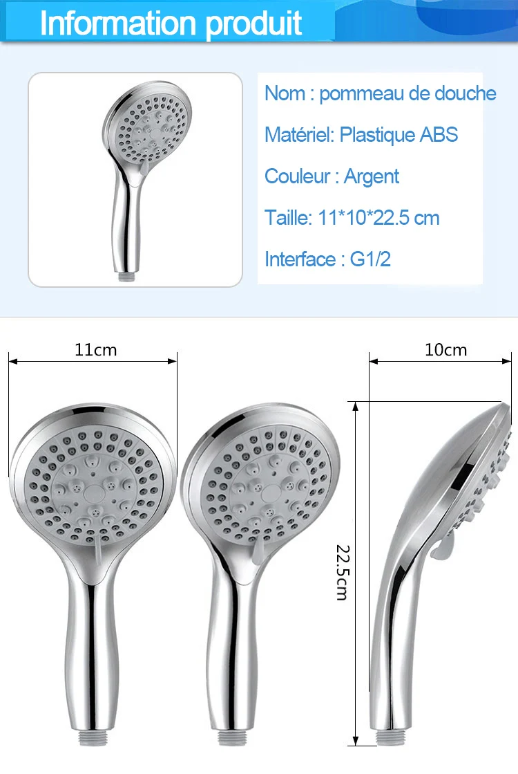 Pommeau de douche rond chromé à grand panneau 225x110mm 5 Modes économie d’eau 5 Modes de pulvérisation conception classique G1/2 pommeau de douche à pluie